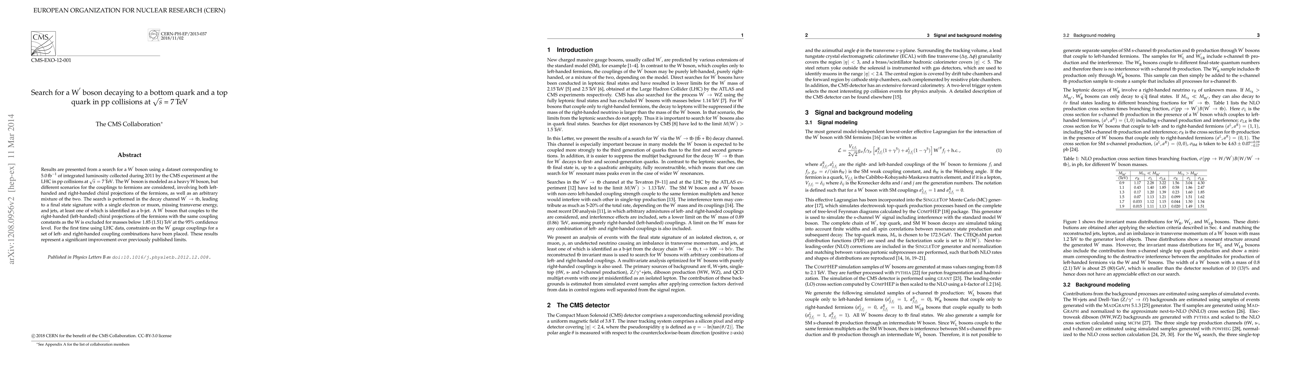 Results are presented from a search for a W' boson using a dataset corresponding to 5.0 inverse femtobarns of integrated luminosity collected during 2011 by the CMS experiment at the LHC in pp collisions at sqrt(s)=7 TeV. The W' boson is modeled as a heavy W boson, but different scenarios for the couplings to fermions are considered, involving both left-handed and right-handed chiral projections of the fermions, as well as an arbitrary mixture of the two. The search is performed in the decay channel W' to t b, leading to a final state signature with a single lepton (e, mu), missing transverse energy, and jets, at least one of which is tagged as a b-jet. A W' boson that couples to fermions with the same coupling constant as the W, but to the right-handed rather than left-handed chiral projections, is excluded for masses below 1.85 TeV at the 95% confidence level. For the first time using LHC data, constraints on the W' gauge coupling for a set of left- and right-handed coupling combinations have been placed. These results represent a significant improvement over previously published limits.