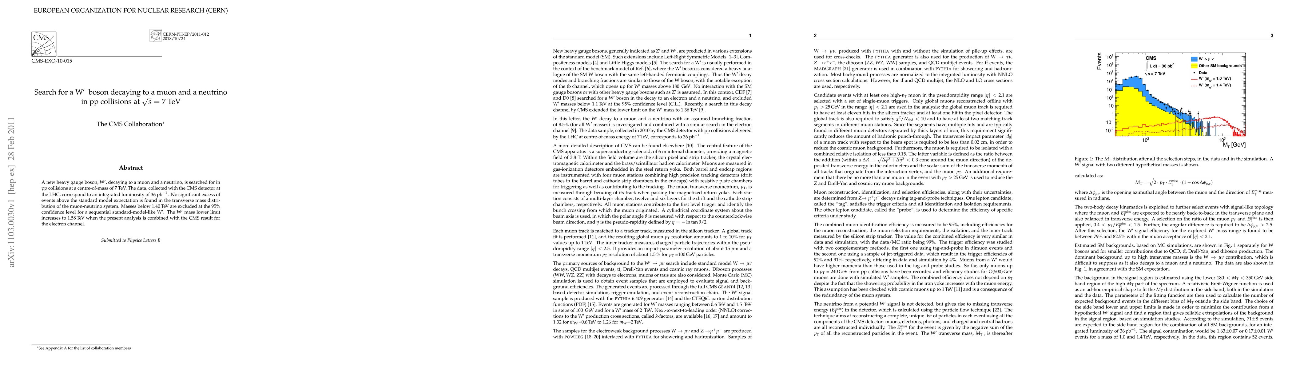 A new heavy gauge boson, W', decaying to a muon and a neutrino, is searched for in pp collisions at a centre-of-mass of 7 TeV. The data, collected with the CMS detector at the LHC, correspond to an integrated luminosity of 36 inverse picobarns. No significant excess of events above the standard model expectation is found in the transverse mass distribution of the muon-neutrino system. Masses below 1.40 TeV are excluded at the 95% confidence level for a sequential standard-model-like W'. The W' mass lower limit increases to 1.58 TeV when the present analysis is combined with the CMS result for the electron channel.