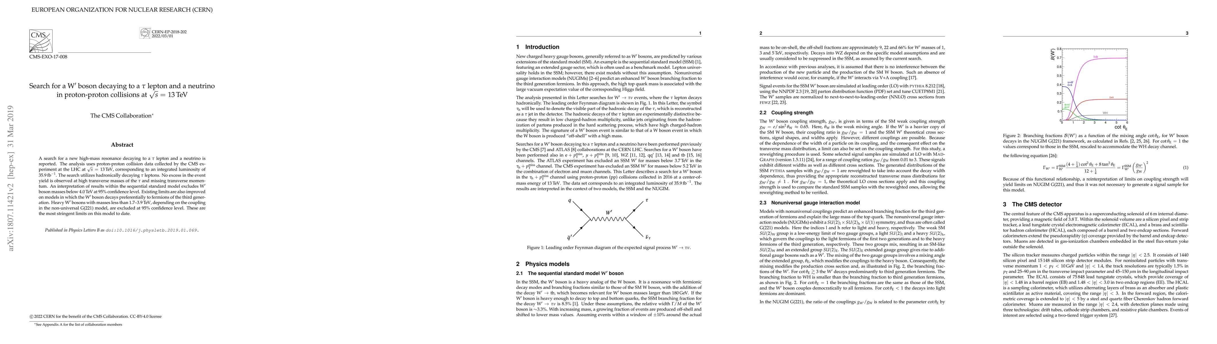The CMS experiment searched for a W' boson decaying into a tau lepton and a neutrino in proton-proton collisions at 13 TeV, but no significant excess was observed. The results exclude W' boson masses below 4.0 TeV in the sequential standard model and set stringent limits on the non-universal G(221) model.