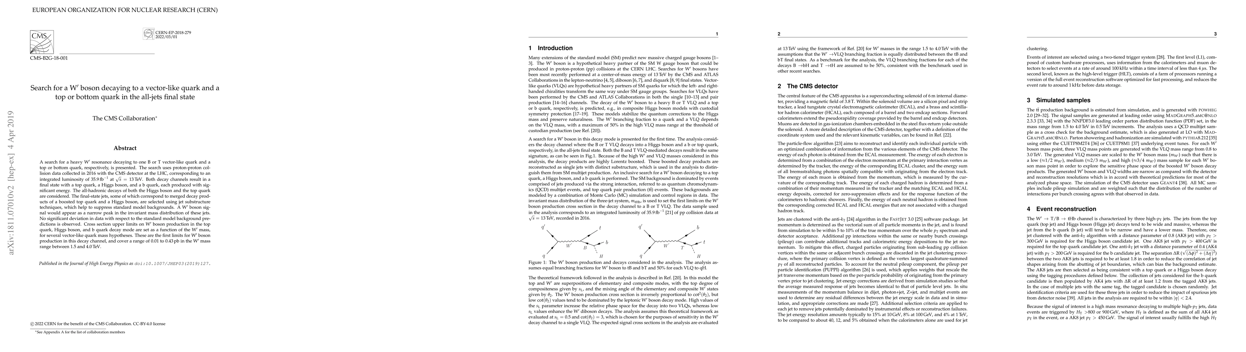 This paper reports a search for a W' boson decaying into a vector-like quark and a top or bottom quark using CMS detector data from 2016 LHC runs. No significant deviations from standard model predictions were observed, leading to the first upper limits on W' boson production cross sections in this decay channel.