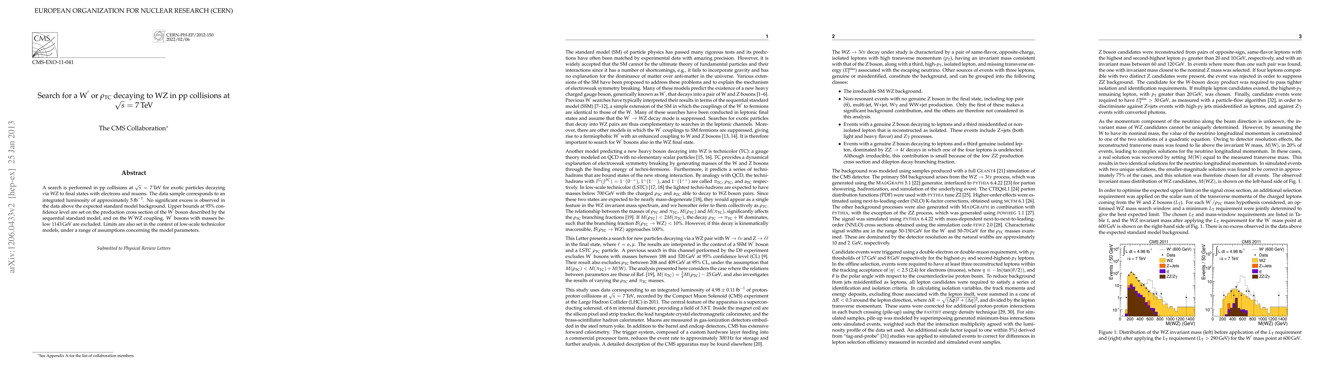 A search is performed in pp collisions at sqrt(s) = 7 TeV for exotic particles decaying via WZ to final states with electrons and muons. The data sample corresponds to an integrated luminosity of approximately 5 inverse femtobarns. No significant excess is observed in the data above the expected standard model background. Upper bounds at 95% confidence level are set on the production cross section of the W' boson described by the sequential standard model and on the W'WZ coupling. W' bosons with masses below 1143 GeV are excluded. Limits are also set in the context of low-scale technicolor models, under a range of assumptions concerning the model parameters.