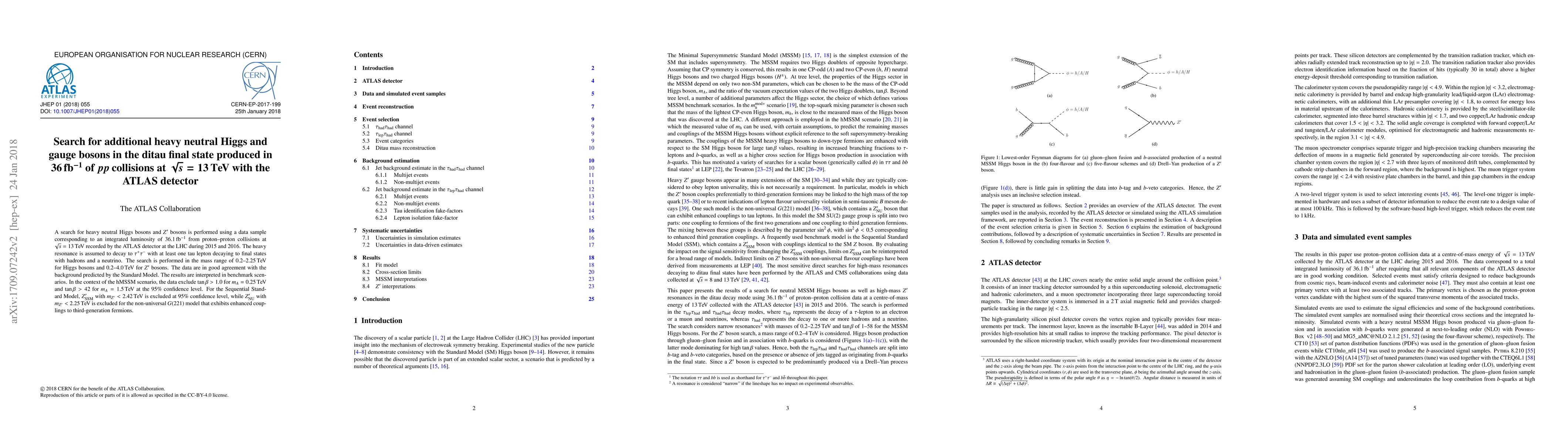 A search for heavy neutral Higgs bosons and $Z^{\prime}$ bosons is performed using a data sample corresponding to an integrated luminosity of 36.1 fb$^{-1}$ from proton-proton collisions at $\sqrt{s}$ = 13 TeV recorded by the ATLAS detector at the LHC during 2015 and 2016. The heavy resonance is assumed to decay to $\tau^+\tau^-$ with at least one tau lepton decaying to final states with hadrons and a neutrino. The search is performed in the mass range of 0.2-2.25 TeV for Higgs bosons and 0.2-4.0 TeV for $Z^{\prime}$ bosons. The data are in good agreement with the background predicted by the Standard Model. The results are interpreted in benchmark scenarios. In the context of the hMSSM scenario, the data exclude $\tan\beta > 1.0$ for $m_A$ = 0.25 TeV and $\tan\beta > 42$ for $m_A$ = 1.5 TeV at the 95% confidence level. For the Sequential Standard Model, $Z^{\prime}_\mathrm{SSM}$ with $m_{Z^{\prime}} < 2.42$ TeV is excluded at 95% confidence level, while $Z^{\prime}_\mathrm{NU}$ with $m_{Z^{\prime}} < 2.25$ TeV is excluded for the non-universal $G(221)$ model that exhibits enhanced couplings to third-generation fermions.