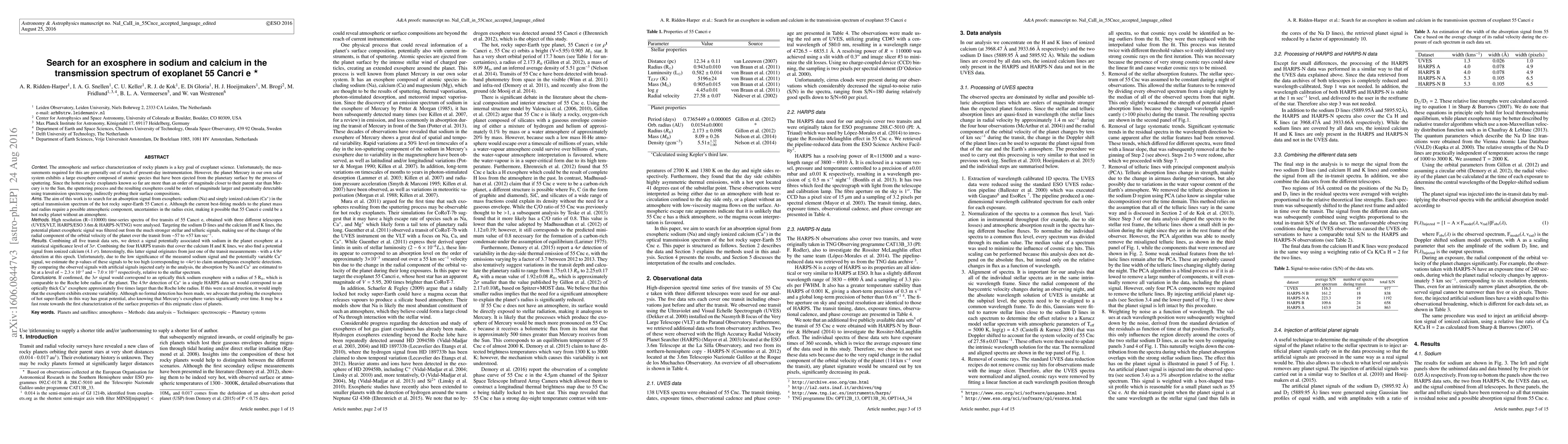 [Abridged] The aim of this work is to search for an absorption signal from exospheric sodium (Na) and singly ionized calcium (Ca$^+$) in the optical transmission spectrum of the hot rocky super-Earth 55 Cancri e. Although the current best-fitting models to the planet mass and radius require a possible atmospheric component, uncertainties in the radius exist, making it possible that 55 Cancri e could be a hot rocky planet without an atmosphere. High resolution (R$\sim$110000) time-series spectra of five transits of 55 Cancri e, obtained with three different telescopes (UVES/VLT, HARPS/ESO 3.6m & HARPS-N/TNG) were analysed. Targeting the sodium D lines and the calcium H and K lines, the potential planet exospheric signal was filtered out from the much stronger stellar and telluric signals, making use of the change of the radial component of the orbital velocity of the planet over the transit from -57 to +57 km/sec. Combining all five transit data sets, we detect a signal potentially associated with sodium in the planet exosphere at a statistical significance level of 3$\sigma$. Combining the four HARPS transits that cover the calcium H and K lines, we also find a potential signal from ionized calcium (4.1 $\sigma$). Interestingly, this latter signal originates from just one of the transit measurements - with a 4.9$\sigma$ detection at this epoch. Unfortunately, due to the low significance of the measured sodium signal and the potentially variable Ca$^+$ signal, we estimate the p-values of these signals to be too high (corresponding to <4$\sigma$) to claim unambiguous exospheric detections. By comparing the observed signals with artificial signals injected early in the analysis, the absorption by Na and Ca$^+$ are estimated to be at a level of approximately 2.3$\times 10^{-3}$ and 7.0$\times 10^{-2}$ respectively, relative to the stellar spectrum.