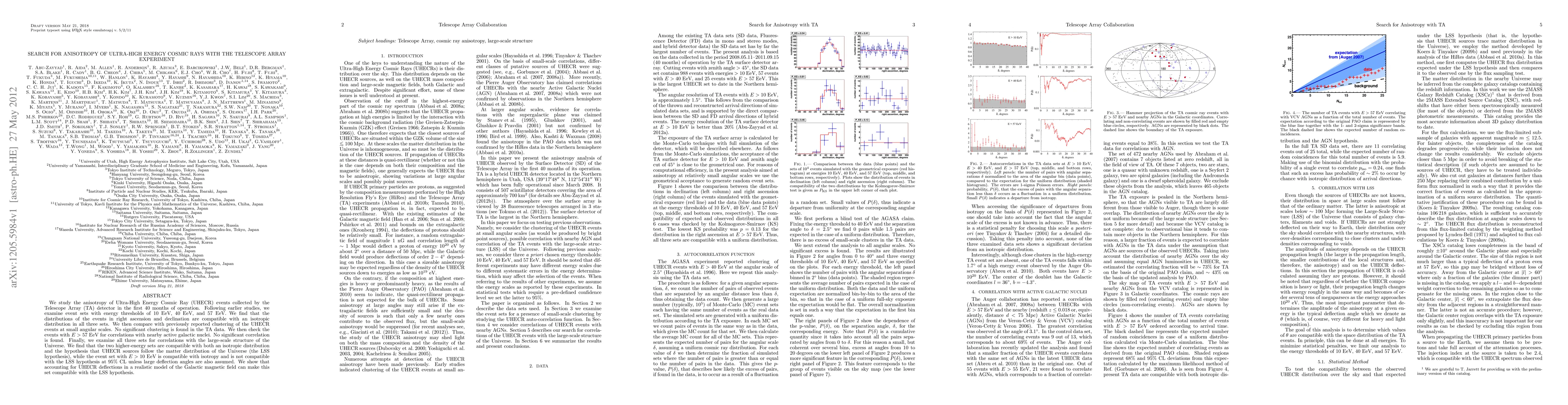 The Telescope Array experiment found no significant anisotropy or clustering in Ultra-High Energy Cosmic Ray events up to 57 EeV, suggesting an isotropic distribution. Higher-energy events (E>10 EeV) align with isotropy but not with the large-scale structure hypothesis unless large deflection angles are considered.