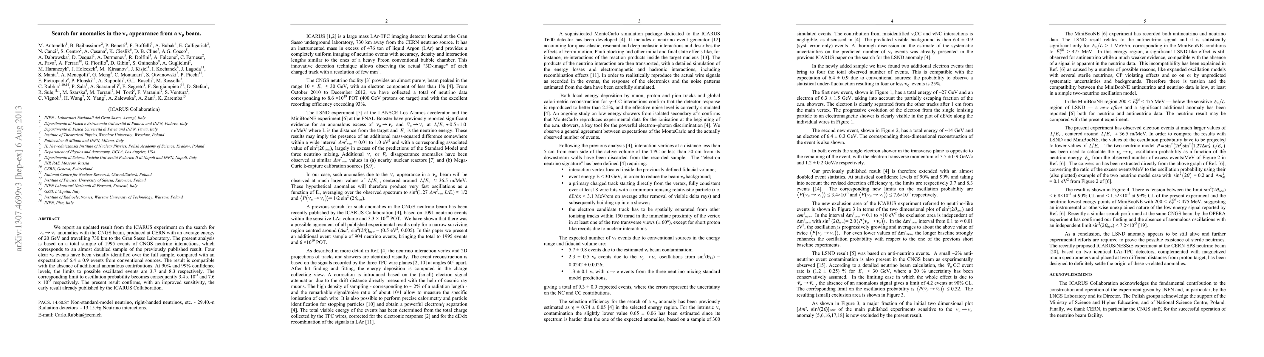 The ICARUS experiment analyzed 1995 CNGS neutrino interaction events, observing 4 excess u03b5e events, deviating from the expected 6.4 u00b1 0.9. At 90% and 99% CL, the study sets limits of 3.7 and 8.3 oscillated events, translating to oscillation probabilities of 3.4 x 10^-3 and 7.6 x 10^-3, respectively. The result confirms previous findings with enhanced sensitivity, suggesting no significant anomalies in u03b5e appearance from a u03b5u03c9 beam.