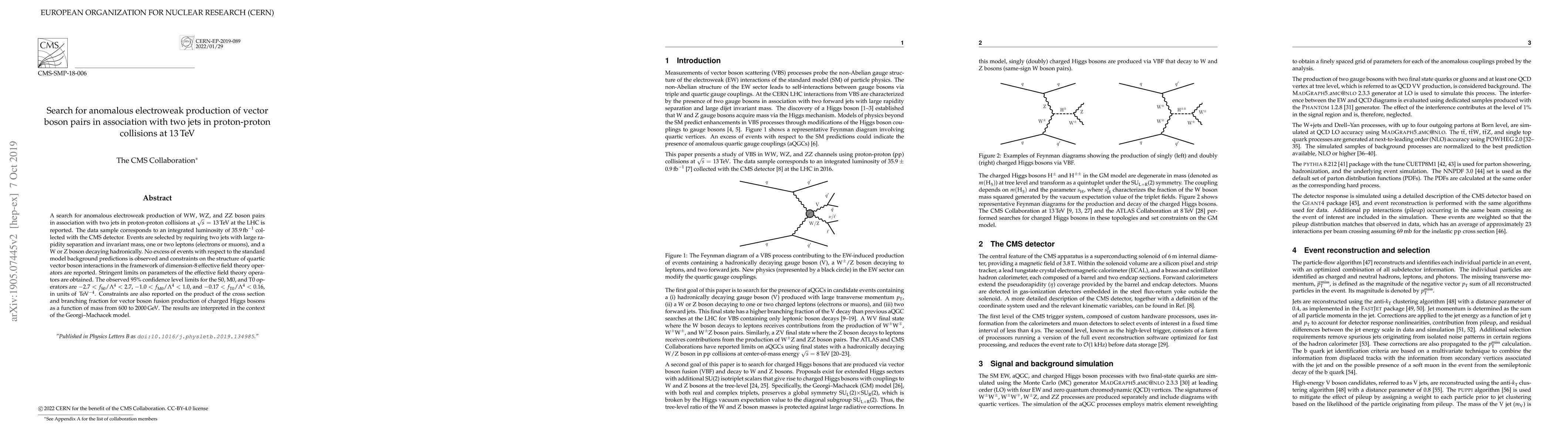 This paper reports a search for anomalous electroweak production of WW, WZ, and ZZ boson pairs with two jets in proton-proton collisions at 13 TeV using the CMS detector. No excess events were observed, leading to stringent limits on parameters of dimension-8 effective field theory operators and constraints on charged Higgs bosons in the Georgi-Machacek model.
