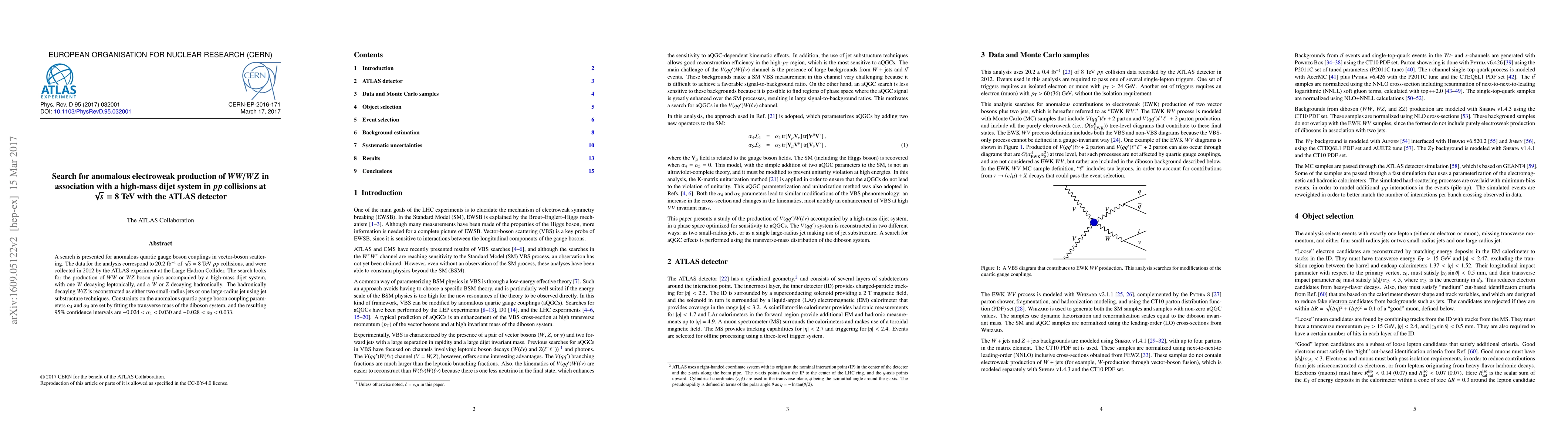 A search is presented for anomalous quartic gauge boson couplings in vector-boson scattering. The data for the analysis correspond to $20.2$ fb$^{-1}$ of $\sqrt{s}=8$ TeV $pp$ collisions, and were collected in 2012 by the ATLAS experiment at the Large Hadron Collider. The search looks for the production of $WW$ or $WZ$ boson pairs accompanied by a high-mass dijet system, with one $W$ decaying leptonically, and a $W$ or $Z$ decaying hadronically. The hadronically decaying $W/Z$ is reconstructed as either two small-radius jets or one large-radius jet using jet substructure techniques. Constraints on the anomalous quartic gauge boson coupling parameters $\alpha_4$ and $\alpha_5$ are set by fitting the transverse mass of the diboson system, and the resulting 95% confidence intervals are $-0.024<\alpha_4<0.030$ and $-0.028<\alpha_5<0.033$.