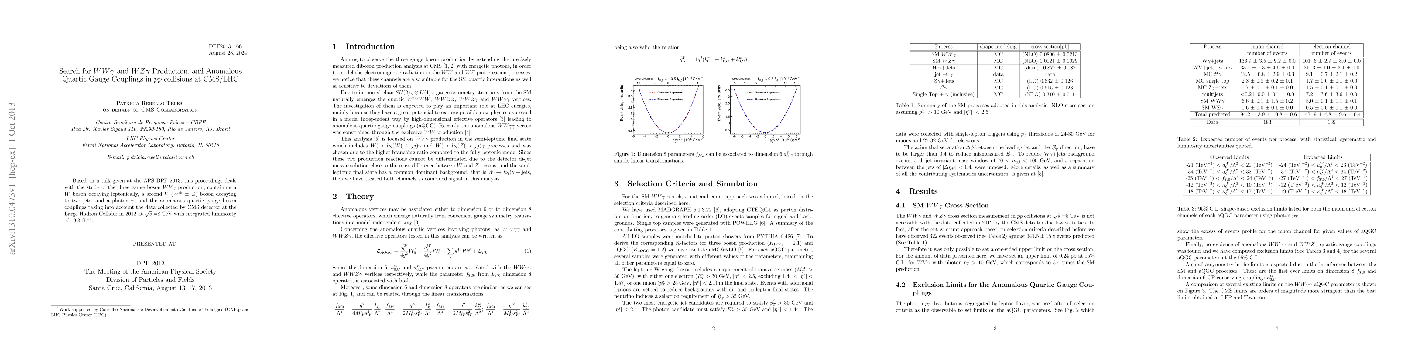 A study of the Standard Model (SM) three electroweak boson production, $WV\gamma$ where V = W or Z gauge boson, is presented concerning events with a leptonically decaying W boson accompanied by a photon and two or more jets. We are using the full 2012 dataset, of proton-proton collisions at a center-of-mass energy of 8 TeV and an integrated luminosity of 19.3 fb${}^{-1}$, collected by the CMS detector at the Large Hadron Collider (LHC). $WV\gamma$ production final states may be sensitive to anomalous $WW\gamma\gamma$ and $WWZ\gamma$ quartic couplings. In light of the recent discovery of a Higgs-like particle, we investigate, in a model independent way, any deviation of gauge boson couplings with respect to the SM prediction by setting limits on the anomalous quartic gauge couplings (aQGC) for $WW\gamma\gamma$ and $WWZ\gamma$. Upper limits at 95% confidence level are obtained, with and without a form factor.