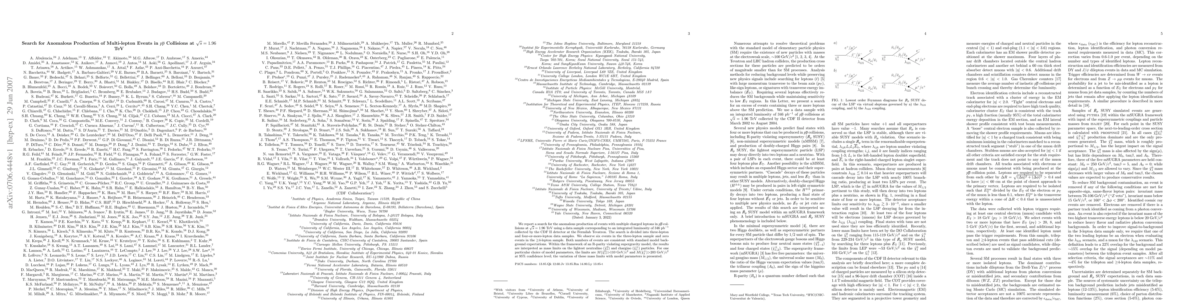 This paper reports a search for anomalous multilepton events in p-pbar collisions at 1.96 TeV, observing six events in the three-lepton sample and none in the four-or-more-lepton sample, consistent with standard model predictions. The results set mass limits for neutralino and chargino particles in an R-parity violating supergravity model.