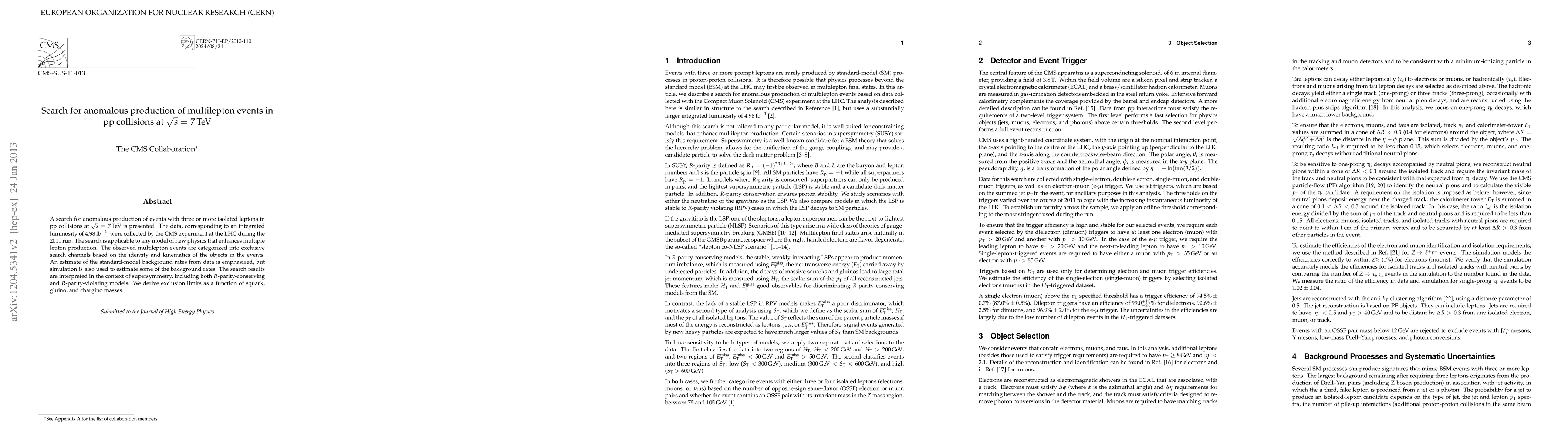 This paper reports a search for anomalous multilepton events in proton-proton collisions at 7 TeV using the CMS experiment at the LHC, focusing on potential new physics beyond the standard model. Exclusion limits are derived for squark, gluino, and chargino masses in the context of supersymmetry.