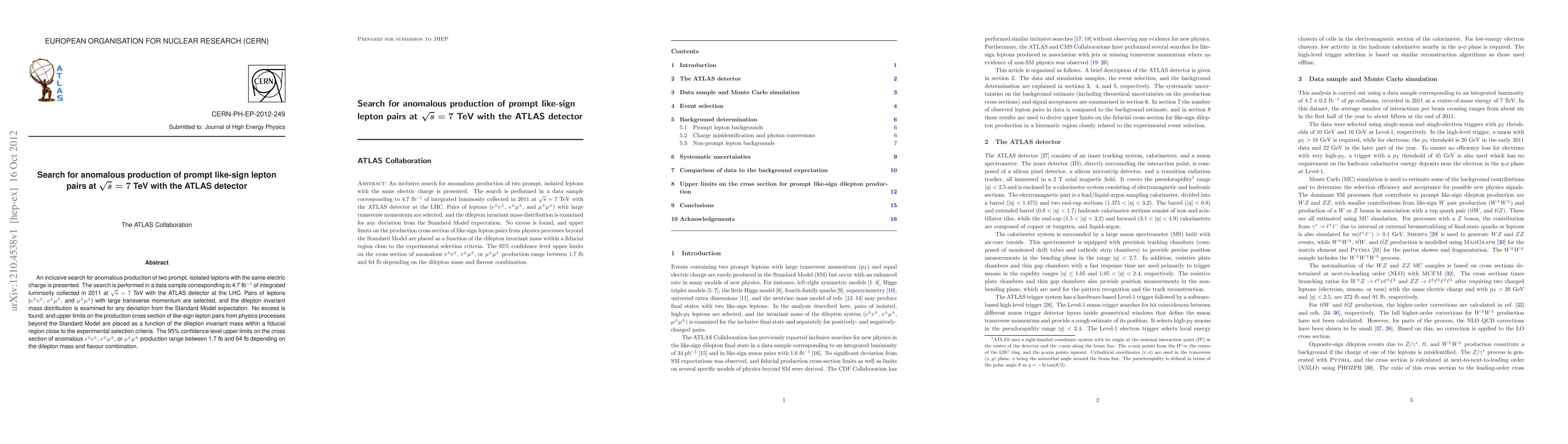 This paper reports an ATLAS search for anomalous production of same-charge lepton pairs at 7 TeV, analyzing 4.7 fb^-1 of data. No deviations from Standard Model predictions were found, establishing upper limits on the cross section for anomalous like-sign lepton pair production.