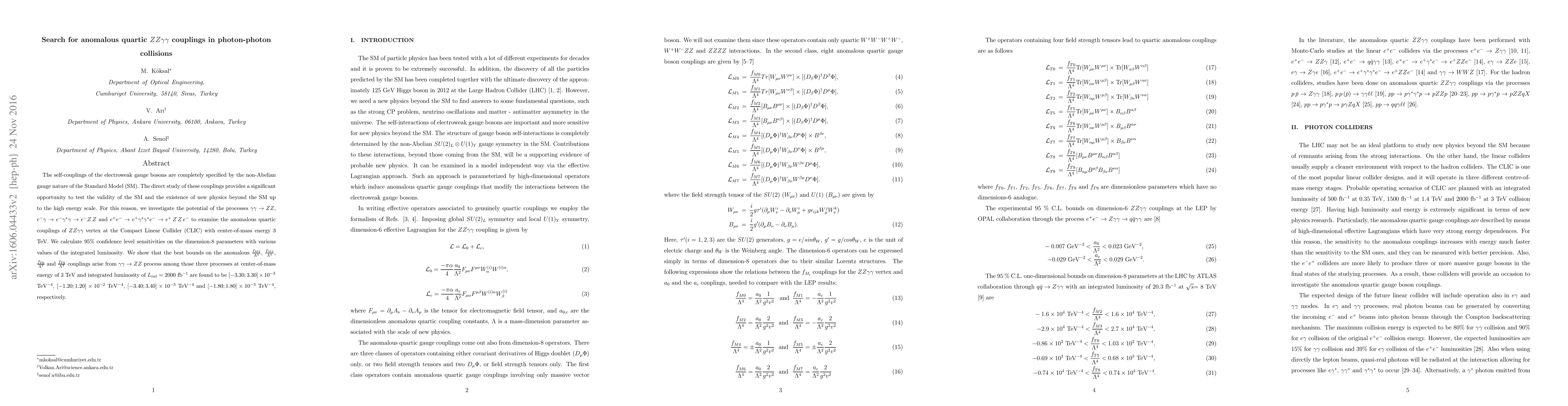 The self-couplings of the electroweak gauge bosons are completely specified by the non-Abelian gauge nature of the Standard Model (SM). The direct study of these couplings provides a significant opportunity to test the validity of the SM and the existence of new physics beyond the SM up to the high energy scale. For this reason, we investigate the potential of the processes $\gamma\gamma\rightarrow ZZ$, $e^{-}\gamma\rightarrow e^{-}\gamma^{*}\gamma \rightarrow e^{-}Z\, Z$ and $e^{+}e^{-} \rightarrow e^{+}\gamma^{*} \gamma^{*} e^{-} \rightarrow e^{+}\, Z\, Z\, e^{-}$ to examine the anomalous quartic couplings of $ZZ\gamma\gamma$ vertex at the Compact Linear Collider (CLIC) with center-of-mass energy $3$ TeV. We calculate $95\%$ confidence level sensitivities on the dimension-8 parameters with various values of the integrated luminosity. We show that the best bounds on the anomalous $\frac{f_{M2}}{\Lambda^{4}}$, $\frac{f_{M3}}{\Lambda^{4}}$, $\frac{f_{T0}}{\Lambda^4}$ and $\frac{f_{T9}}{\Lambda^4}$ couplings arise from $\gamma\gamma\rightarrow ZZ$ process among those three processes at center-of-mass energy of 3 TeV and integrated luminosity of $L_{int}=2000$ fb$^{-1}$ are found to be $[-3.30;3.30]\times 10 ^{-3}$ TeV$^{-4}$, $[-1.20;1.20]\times 10 ^{-2}$ TeV$^{-4}$, $[-3.40;3.40]\times 10 ^{-3}$ TeV$^{-4}$ and $[-1.80;1.80]\times 10 ^{-3}$ TeV$^{-4}$, respectively.
