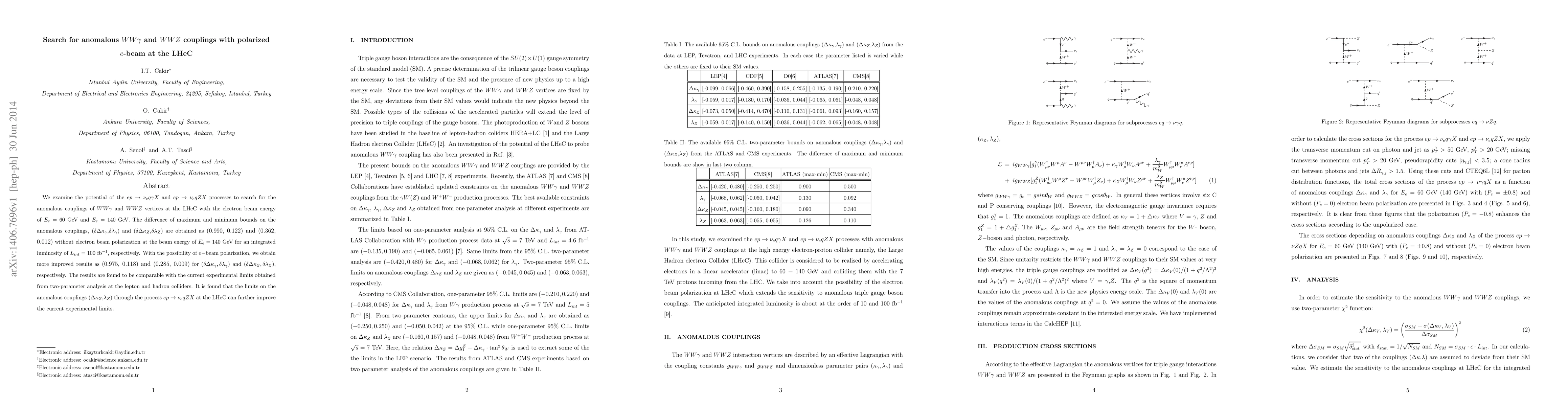 We examine the potential of the $ep\to\nu_{e}q\gamma X$ and $ep\to\nu_{e}qZX$ processes to search for the anomalous couplings of $WW\gamma$ and $WWZ$ vertices at the LHeC with the electron beam energy of $E_{e}=60$ GeV and $E_{e}=140$ GeV. The difference of maximum and minimum bounds on the anomalous couplings, ($\delta\Delta\kappa_{\gamma}$, $\delta\lambda_{\gamma}$) and ($\delta\Delta\kappa_{Z}$, $\delta\lambda_{Z}$) are obtained as ($0.990$, $0.122$) and ($0.362$, $0.012$) without electron beam polarization at the beam energy of $E_{e}=140$ GeV for an integrated luminosity of $L_{int}=100$ fb$^{-1}$, respectively. With the possibility of $e-$beam polarization, we obtain more improved results as ($0.975$, $0.118$) and ($0.285$, $0.009$) for ($\delta\Delta\kappa_{\gamma}, \delta\lambda_{\gamma}$) and ($\delta\Delta\kappa_{Z}, \delta\lambda_{Z}$), respectively. The results are found to be comparable with the current experimental limits obtained from two-parameter analysis at the lepton and hadron colliders. It is found that the limits on the anomalous couplings ($\Delta\kappa_{Z}$, $\lambda_{Z}$) through the process $ep\to\nu_{e}qZX$ at the LHeC can further improve the current experimental limits.