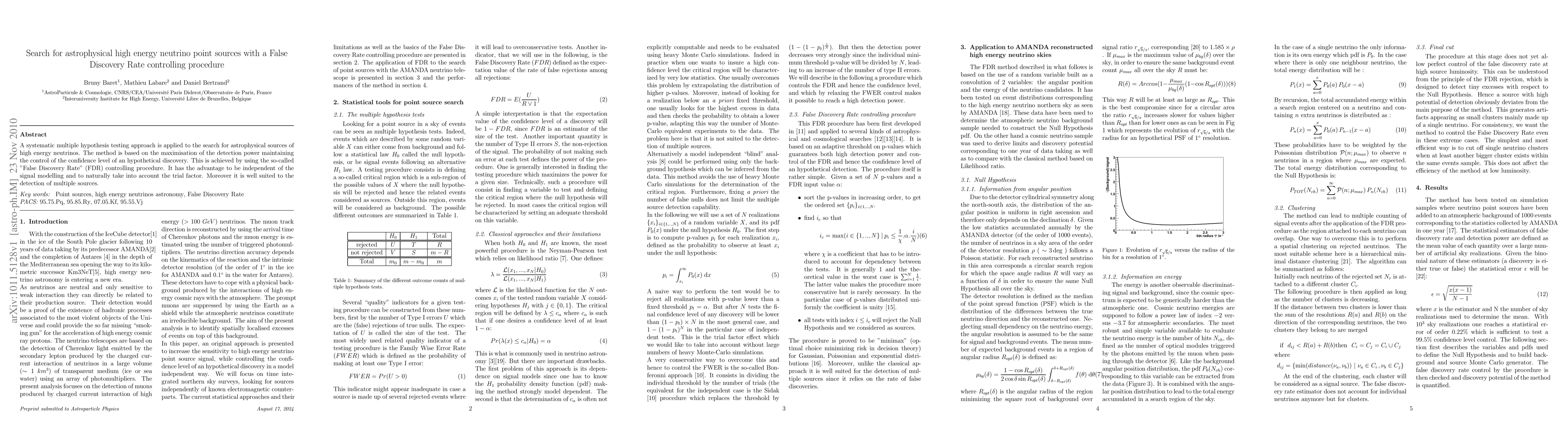A systematic multiple hypothesis testing approach is applied to the search for astrophysical sources of high energy neutrinos. The method is based on the maximisation of the detection power maintaining the control of the confidence level of an hypothetical discovery. This is achieved by using the so-called "False Discovery Rate" (FDR) controlling procedure. It has the advantage to be independent of the signal modelling and to naturally take into account the trial factor. Moreover it is well suited to the detection of multiple sources.