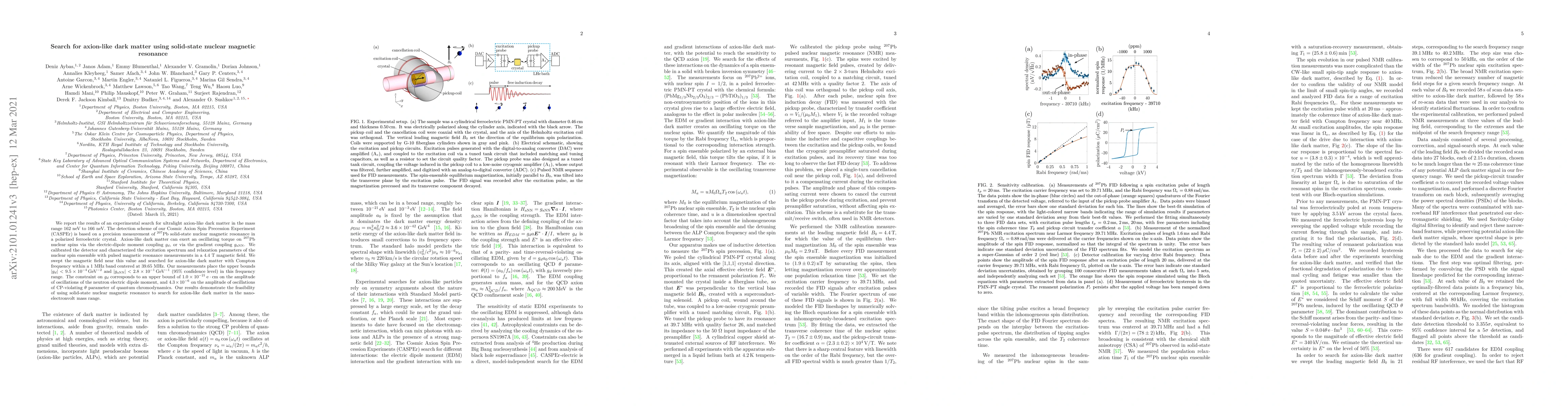 We report the results of an experimental search for ultralight axion-like dark matter in the mass range 162 neV to 166 neV. The detection scheme of our Cosmic Axion Spin Precession Experiment (CASPEr) is based on a precision measurement of $^{207}$Pb solid-state nuclear magnetic resonance in a polarized ferroelectric crystal. Axion-like dark matter can exert an oscillating torque on $^{207}$Pb nuclear spins via the electric-dipole moment coupling $g_d$, or via the gradient coupling $g_{\text{aNN}}$. We calibrated the detector and characterized the excitation spectrum and relaxation parameters of the nuclear spin ensemble with pulsed magnetic resonance measurements in a 4.4 T magnetic field. We swept the magnetic field near this value and searched for axion-like dark matter with Compton frequency within a 1 MHz band centered at 39.65 MHz. Our measurements place the upper bounds $|g_d|<9.5\times10^{-4}\,\text{GeV}^{-2}$ and $|g_{\text{aNN}}|<2.8\times10^{-1}\,\text{GeV}^{-1}$ (95% confidence level) in this frequency range. The constraint on $g_d$ corresponds to an upper bound of $1.0\times 10^{-21}\,\text{e}\cdot\text{cm}$ on the amplitude of oscillations of the neutron electric dipole moment, and $4.3\times 10^{-6}$ on the amplitude of oscillations of CP-violating $\theta$ parameter of quantum chromodynamics. Our results demonstrate the feasibility of using solid-state nuclear magnetic resonance to search for axion-like dark matter in the nano-electronvolt mass range.