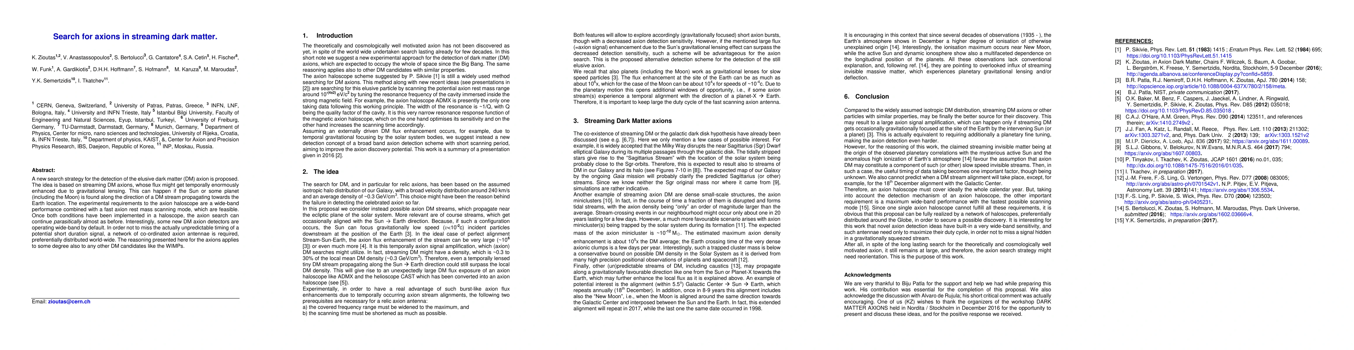 A new search strategy for the detection of the elusive dark matter (DM) axion is proposed. The idea is based on streaming DM axions, whose flux might get temporally enormously enhanced due to gravitational lensing. This can happen if the Sun or some planet (including the Moon) is found along the direction of a DM stream propagating towards the Earth location. The experimental requirements to the axion haloscope are a wide-band performance combined with a fast axion rest mass scanning mode, which are feasible. Once both conditions have been implemented in a haloscope, the axion search can continue parasitically almost as before. Interestingly, some new DM axion detectors are operating wide-band by default. In order not to miss the actually unpredictable timing of a potential short duration signal, a network of co-ordinated axion antennae is required, preferentially distributed world-wide. The reasoning presented here for the axions applies to some degree also to any other DM candidates like the WIMPs.
