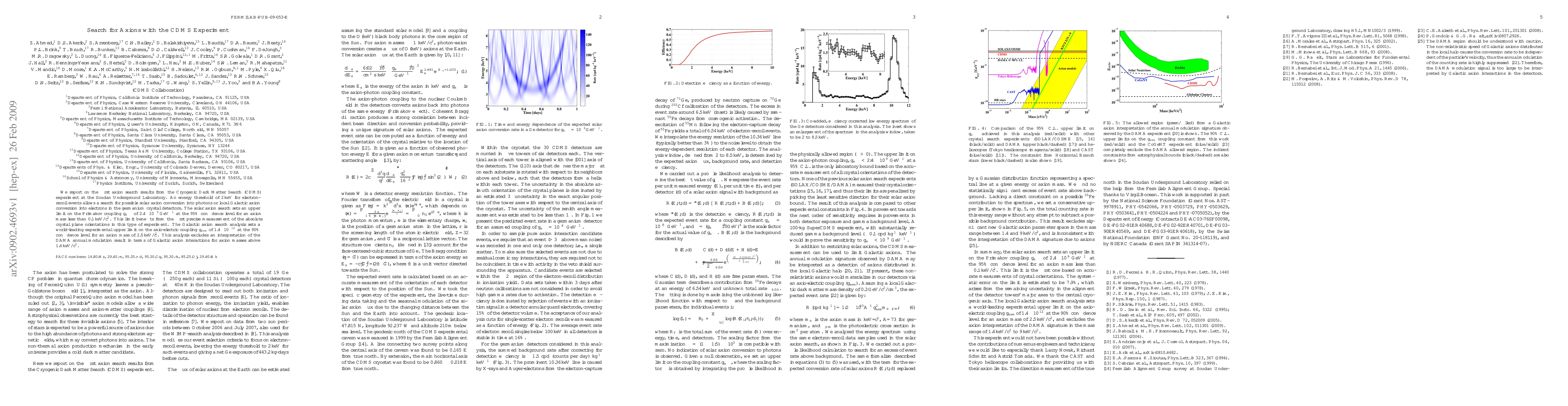 The CDMS experiment reports the first search for axions, setting stringent upper limits on their coupling constants. The solar axion search limits the Primakov coupling to $2.4 \times 10^{-9}$ GeV$^{-1}$ at 95% confidence, while the Galactic axion search limits the axio-electric coupling to $1.4 \times 10^{-12}$ at 90% confidence.