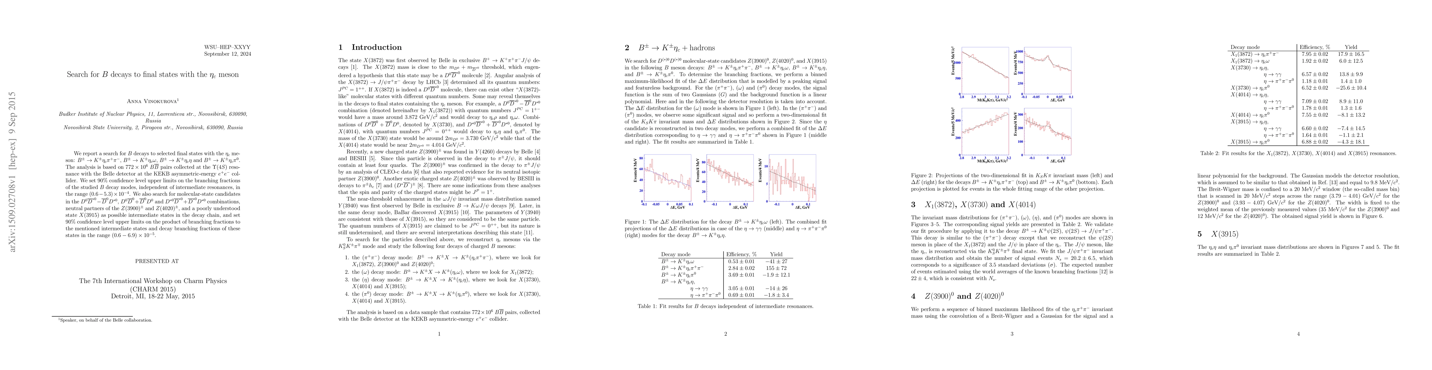 We report a search for $B$ decays to selected final states with the $\eta_c$ meson: $B^{\pm}\to K^{\pm}\eta_c\pi^+\pi^-$, $B^{\pm}\to K^{\pm}\eta_c\omega$, $B^{\pm}\to K^{\pm}\eta_c\eta$ and $B^{\pm}\to K^{\pm}\eta_c\pi^0$. The analysis is based on $772\times 10^6$ $B\bar{B}$ pairs collected at the $\Upsilon(4S)$ resonance with the Belle detector at the KEKB asymmetric-energy $e^+e^-$ collider. We set 90% confidence level upper limits on the branching fractions of the studied $B$ decay modes, independent of intermediate resonances, in the range $(0.6-5.3)\times 10^{-4}$. We also search for molecular-state candidates in the $D^0\bar{D}^{*0}-\bar{D}^0D^{*0}$, $D^0\bar{D}^0+\bar{D}^0D^0$ and $D^{*0}\bar{D}^{*0}+\bar{D}^{*0}D^{*0}$ combinations, neutral partners of the $Z(3900)^{\pm}$ and $Z(4020)^{\pm}$, and a poorly understood state $X(3915)$ as possible intermediate states in the decay chain, and set 90% confidence level upper limits on the product of branching fractions to the mentioned intermediate states and decay branching fractions of these states in the range $(0.6-6.9)\times 10^{-5}$.