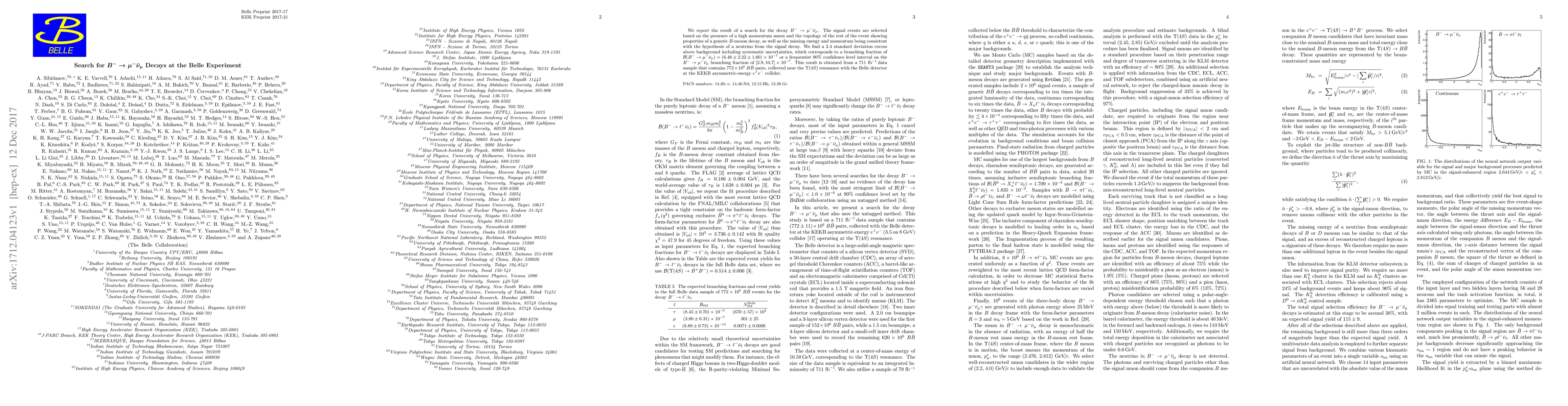 The Belle experiment reports a 2.4 standard deviation excess suggesting the decay $B^{-} omu^{-}ar u_mu$, corresponding to a branching fraction of $(6.46 pm 2.22 pm 1.60 ) imes10^{-7}$. This result is based on analyzing a $711 ext{fb}^{-1}$ data sample containing $772 imes 10^6$ $Bar{B}$ pairs collected near the $Upsilon(4S)$ resonance.