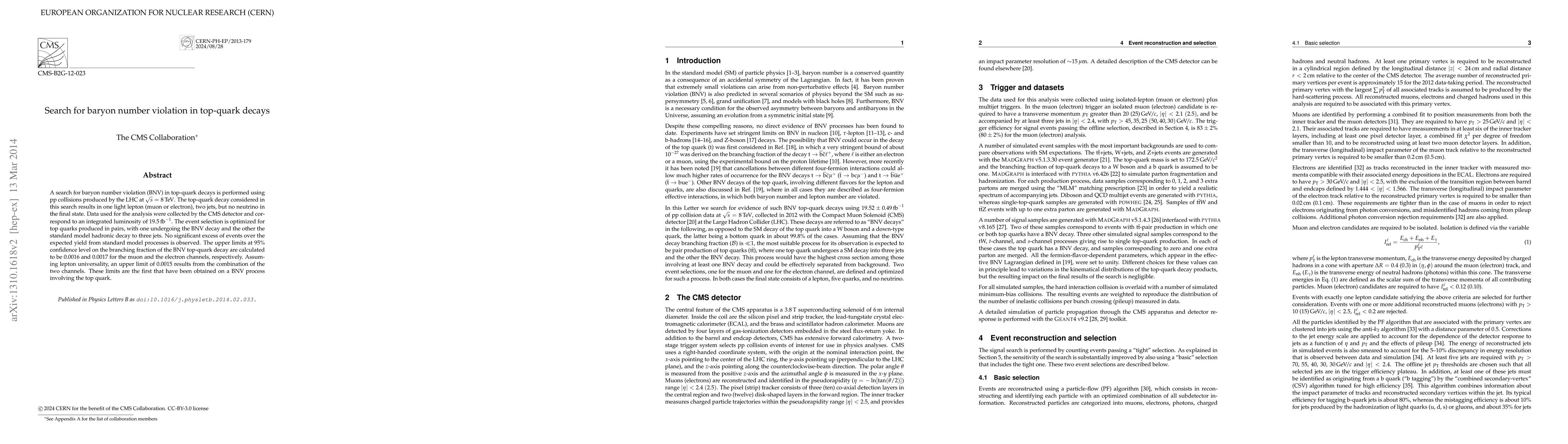 The paper presents a novel search strategy for baryon number violation in top-quark decays, utilizing a unique final state with one lepton, two jets, and no neutrino, and sets the first limits on BNV processes involving top quarks.
