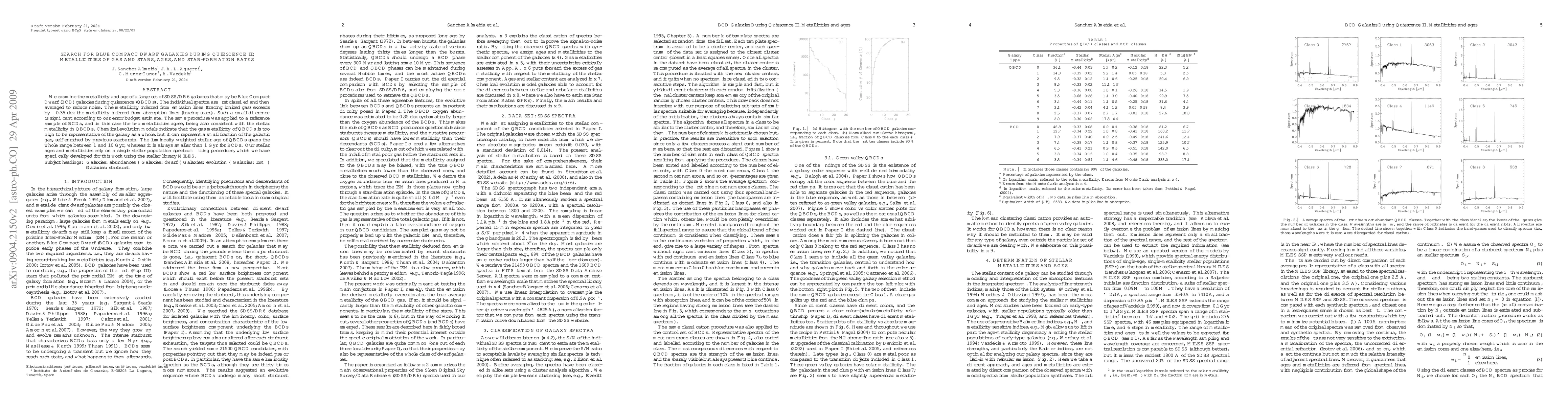 We examine the metallicity and age of a large set of SDSS/DR6 galaxies that may be Blue Compact Dwarf (BCD) galaxies during quiescence (QBCDs).The individual spectra are first classified and then averaged to reduce noise. The metallicity inferred from emission lines (tracing ionized gas) exceeds by ~0.35 dex the metallicity inferred from absorption lines (tracing stars). Such a small difference is significant according to our error budget estimate. The same procedure was applied to a reference sample of BCDs, and in this case the two metallicities agree, being also consistent with the stellar metallicity in QBCDs. Chemical evolution models indicate that the gas metallicity of QBCDs is too high to be representative of the galaxy as a whole, but it can represent a small fraction of the galactic gas, self enriched by previous starbursts. The luminosity weighted stellar age of QBCDs spans the whole range between 1 and 10 Gyr, whereas it is always smaller than 1 Gyr for BCDs. Our stellar ages and metallicities rely on a single stellar population spectrum fitting procedure, which we have specifically developed for this work using the stellar library MILES.