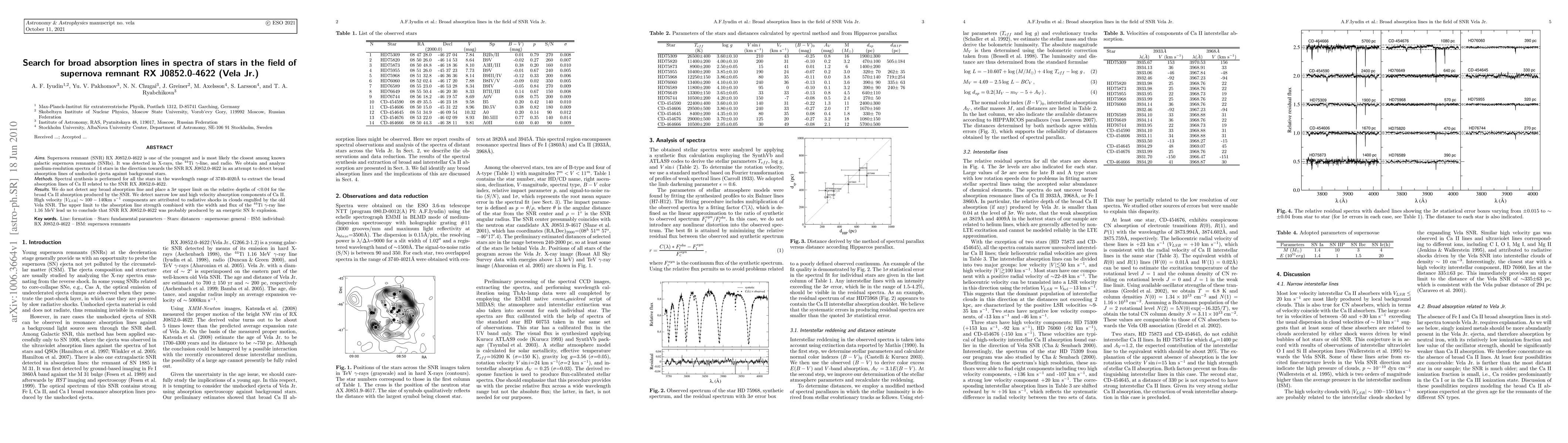 This study analyzes spectra of 14 stars near the young supernova remnant RX J0852.0-4622 to search for broad absorption lines indicative of unshocked supernova ejecta but finds none, placing an upper limit on their relative depths. Narrow absorption components suggest interactions with old Vela SNR shocks. The findings suggest RX J0852.0-4622 likely resulted from an energetic SN Ic explosion.