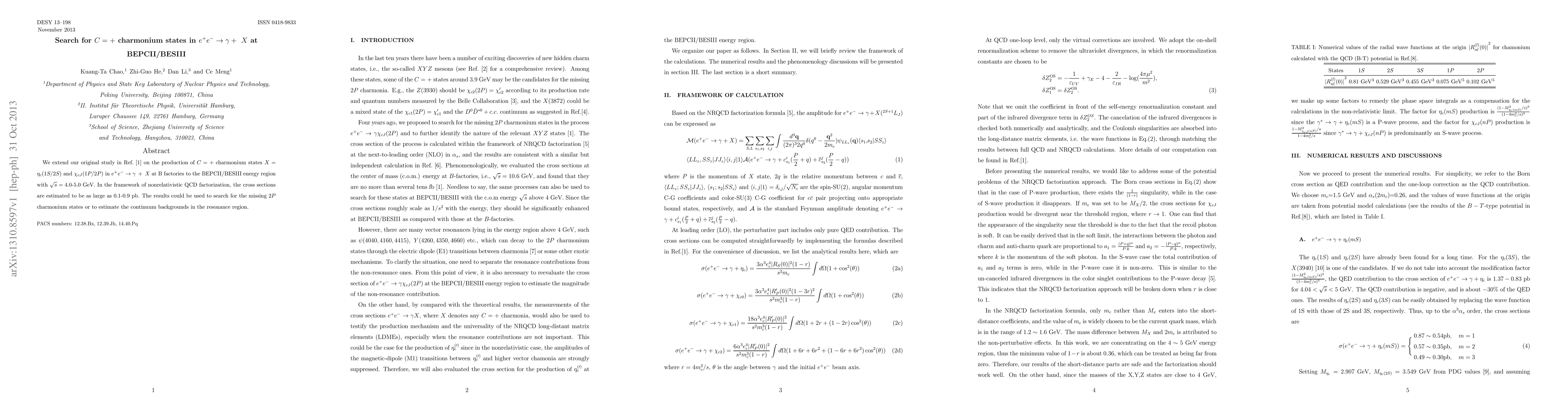We extend our original study in Ref. [1] on the production of $C=+$ charmonium states $X=\eta_c(1S/2S)$ and $\chi_{cJ}(1P/2P)$ in $e^+e^-\to\gamma~+~X$ at B factories to the BEPCII/BESIII energy region with $\sqrt{s}=4.0\mbox{-}5.0$ GeV. In the framework of nonrelativistic QCD factorization, the cross sections are estimated to be as large as $0.1\mbox{-}0.9$ pb. The results could be used to search for the missing $2P$ charmonium states or to estimate the continuum backgrounds in the resonance region.