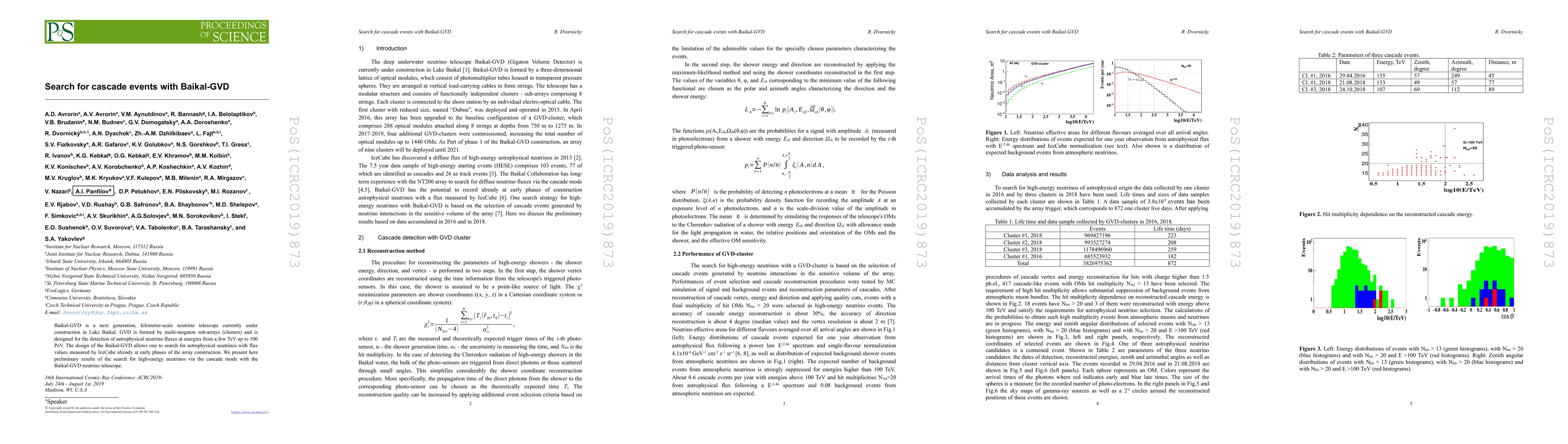 This paper reports preliminary findings from the Baikal-GVD neutrino telescope in Lake Baikal, focusing on the search for high-energy astrophysical neutrinos via cascade events. The telescope, designed to detect neutrinos from a few TeV to 100 PeV, is still under construction but aims to achieve early detection capabilities similar to those of IceCube.