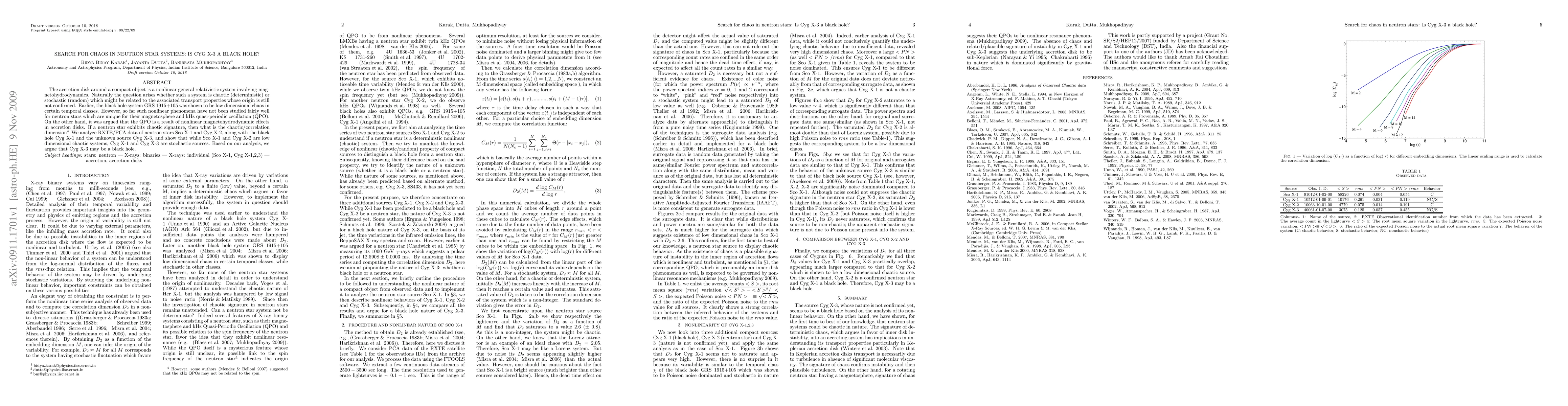 This paper investigates the chaotic nature of neutron star systems, specifically focusing on whether Cyg X-3 is a black hole. The study finds that while Sco X-1 and Cyg X-2 exhibit low-dimensional chaos, Cyg X-1 and Cyg X-3 show stochastic behavior, suggesting Cyg X-3 might be a black hole.