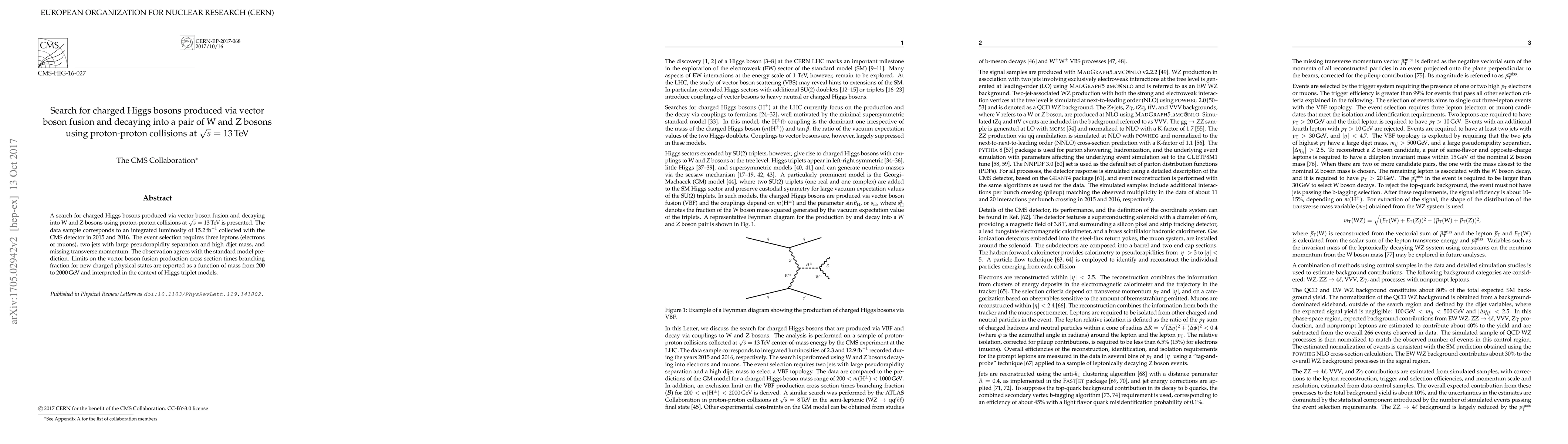 A search for charged Higgs bosons produced via vector boson fusion and decaying into W and Z bosons using proton-proton collisions at sqrt(s) = 13 TeV is presented. The data sample corresponds to an integrated luminosity of 15.2 inverse femtobarns collected with the CMS detector in 2015 and 2016. The event selection requires three leptons (electrons or muons), two jets with large pseudorapidity separation and high dijet mass, and missing transverse momentum. The observation agrees with the standard model prediction. Limits on the vector boson fusion production cross section times branching fraction for new charged physical states are reported as a function of mass from 200 to 2000 GeV and interpreted in the context of Higgs triplet models.
