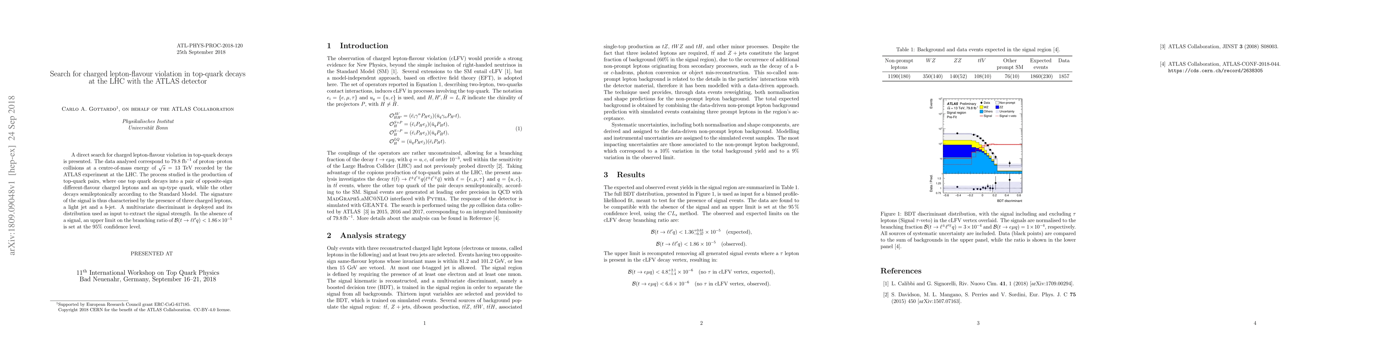 A direct search for charged lepton-flavour violation in top-quark decays is presented. The data analysed correspond to $79.8\ \text{fb}^{-1}$ of proton--proton collisions at a centre-of-mass energy of $\sqrt{s}=13\ \text{TeV}$ recorded by the ATLAS experiment at the LHC. The process studied is the production of top-quark pairs, where one top quark decays into a pair of opposite-sign different-flavour charged leptons and an up-type quark, while the other decays semileptonically according to the Standard Model. The signature of the signal is thus characterised by the presence of three charged leptons, a light jet and a $b$-jet. A multivariate discriminant is deployed and its distribution used as input to extract the signal strength. In the absence of a signal, an upper limit on the branching ratio of ${\cal B}(t \to \ell \ell' q) < 1.86 \times 10^{-5}$ is set at the 95\% confidence level.
