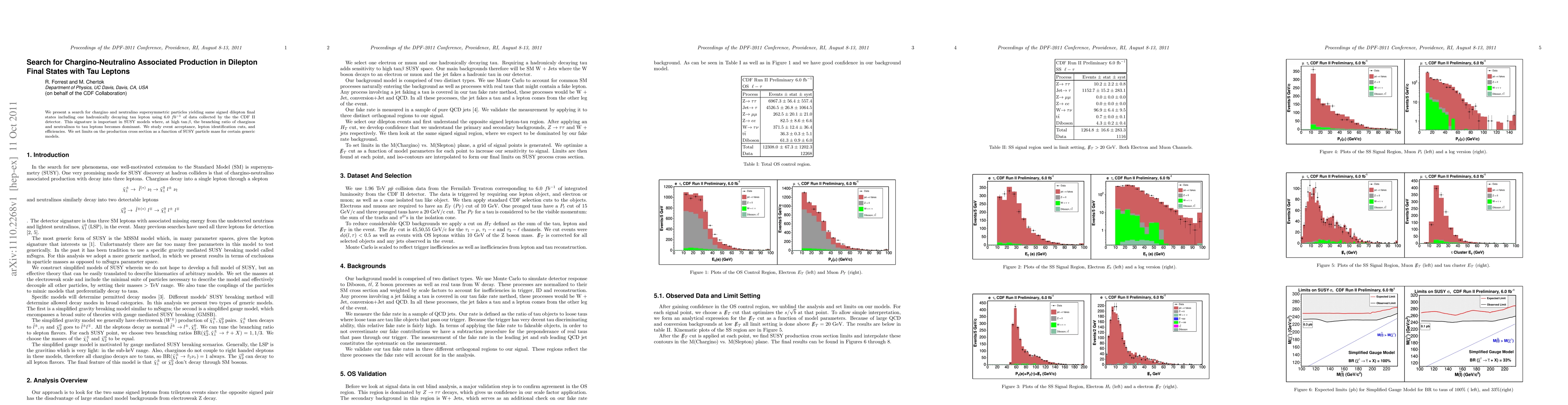 We present a search for chargino and neutralino supersymmetric particles yielding same signed dilepton final states including one hadronically decaying tau lepton using 6.0 $fb^{-1}$ of data collected by the the CDF II detector. This signature is important in SUSY models where, at high $\tan{\beta}$, the branching ratio of charginos and neutralinos to tau leptons becomes dominant. We study event acceptance, lepton identification cuts, and efficiencies. We set limits on the production cross section as a function of SUSY particle mass for certain generic models.