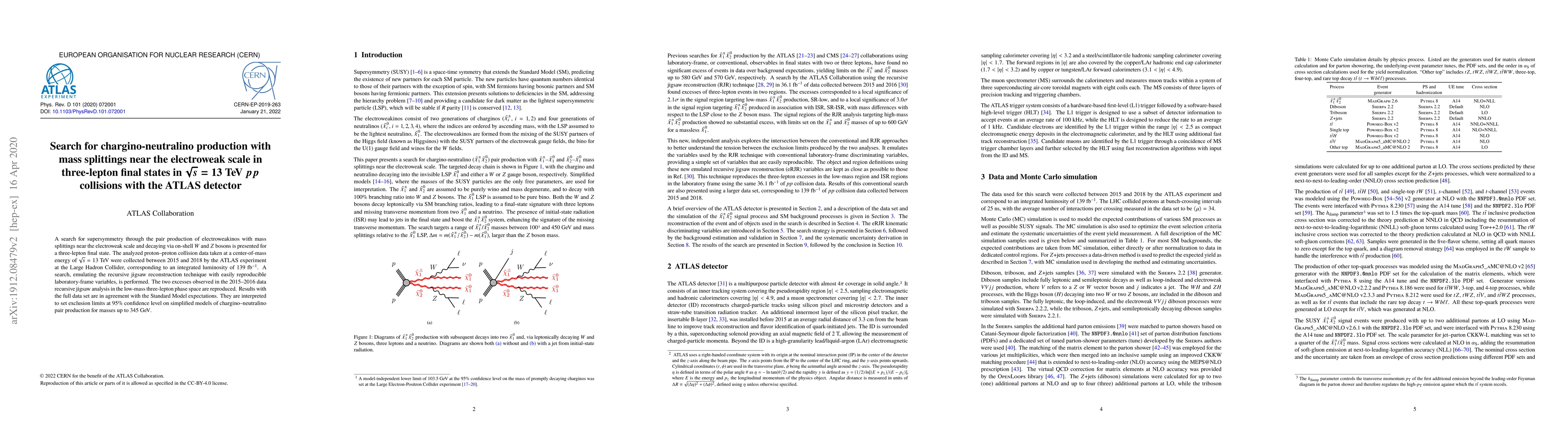This paper reports a search for chargino-neutralino pair production in three-lepton final states at the 13 TeV LHC using the ATLAS detector, finding no evidence of supersymmetry beyond the Standard Model and setting exclusion limits up to 345 GeV. The results are consistent with Standard Model predictions.