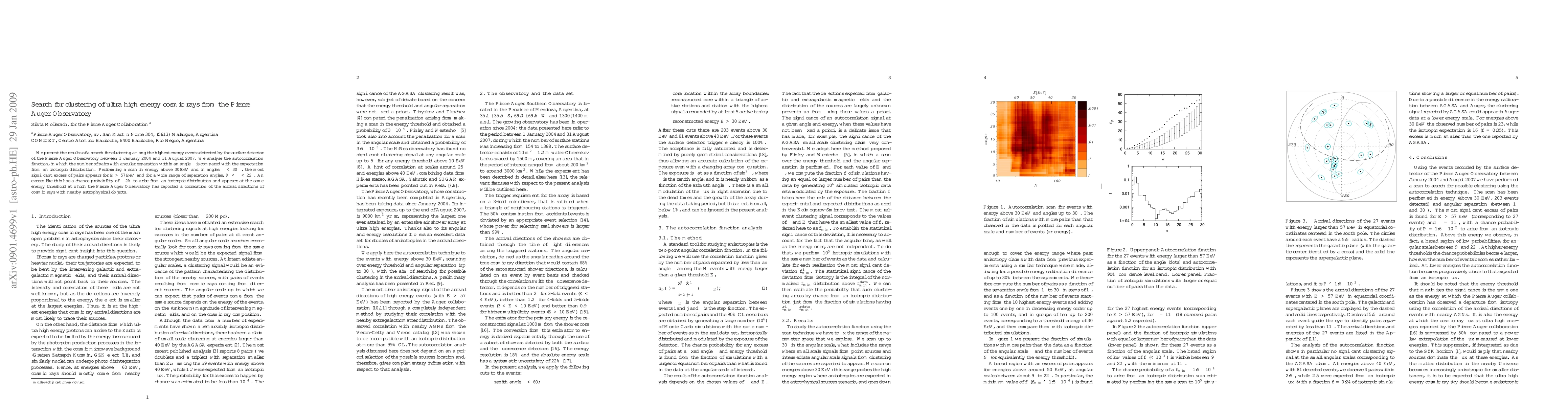 The Pierre Auger Observatory detected a significant clustering of ultra-high energy cosmic rays above 57 EeV, with an excess probability of 2% to arise from an isotropic distribution, suggesting a non-random pattern in arrival directions. This clustering aligns with previous findings of cosmic ray correlations with nearby astrophysical objects.