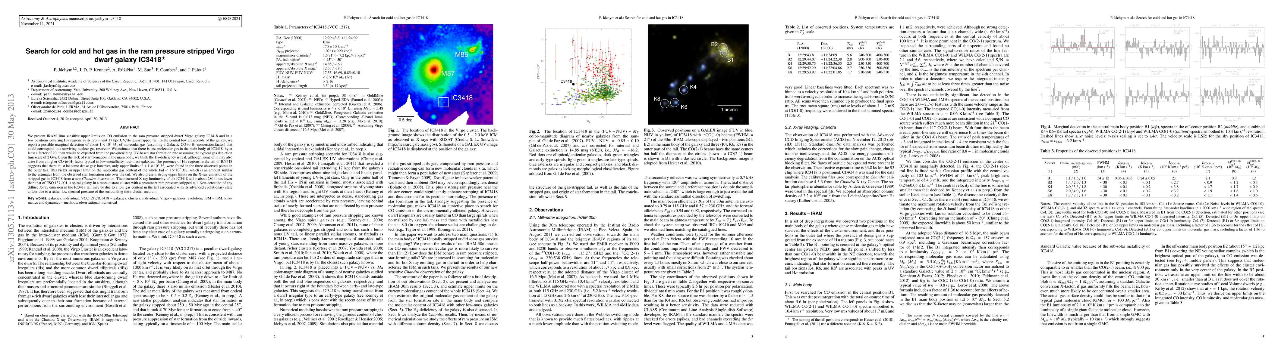 We present IRAM 30m sensitive upper limits on CO emission in the ram pressure stripped dwarf Virgo galaxy IC3418 and in a few positions covering HII regions in its prominent 17 kpc UV/Ha gas-stripped tail. In the central few arcseconds of the galaxy, we report a possible marginal detection of about 1x10^6 M_sun of molecular gas (assuming a Galactic CO-to-H_2 conversion factor) that could correspond to a surviving nuclear gas reservoir. We estimate that there is less molecular gas in the main body of IC3418, by at least a factor of 20, than would be expected from the pre-quenching UV-based star formation rate assuming the typical gas depletion timescale of 2 Gyr. Given the lack of star formation in the main body, we think the H_2-deficiency is real, although some of it may also arise from a higher CO-to-H_2 factor typical in low-metallicity, low-mass galaxies. The presence of HII regions in the tail of IC3418 suggests that there must be some dense gas; however, only upper limits of < 1x10^6 M_sun were found in the three observed points in the outer tail. This yields an upper limit on the molecular gas content of the whole tail < 1x10^7 M_sun, which is an amount similar to the estimates from the observed star formation rate over the tail. We also present strong upper limits on the X-ray emission of the stripped gas in IC3418 from a new Chandra observation. The measured X-ray luminosity of the IC3418 tail is about 280 times lower than that of ESO 137-001, a spiral galaxy in a more distant cluster with a prominent ram pressure stripped tail. Non-detection of any diffuse X-ray emission in the IC3418 tail may be due to a low gas content in the tail associated with its advanced evolutionary state and/or due to a rather low thermal pressure of the surrounding intra-cluster medium.