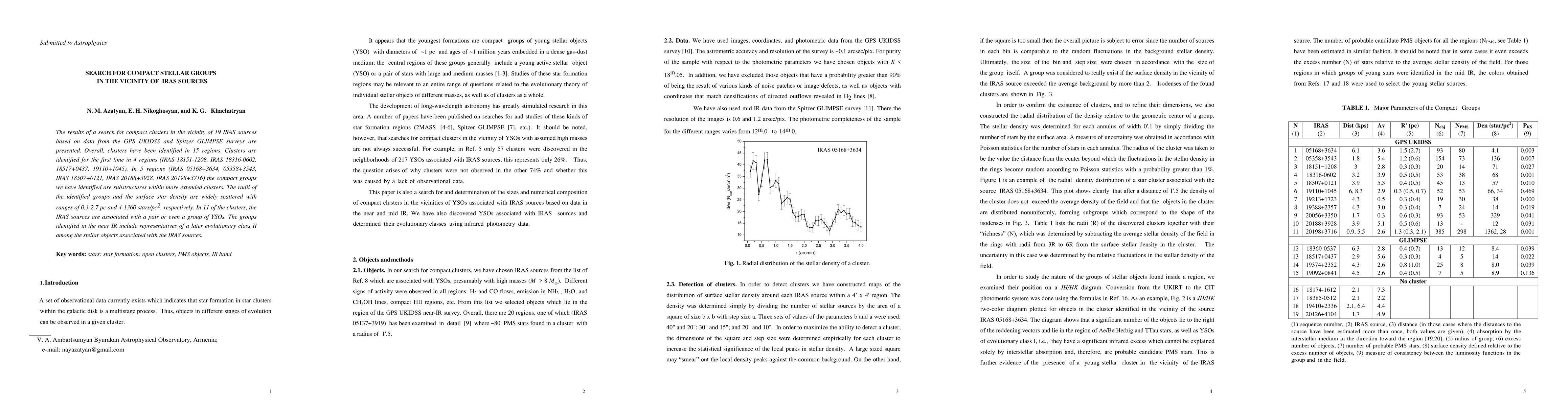 The results of a search for compact clusters in the vicinity of 19 IRAS sources based on data from the GPS UKIDSS and Spitzer GLIMPSE surveys are presented. Overall, clusters have been identified in 15 regions. Clusters are identified for the first time in 4 regions (IRAS 18151-1208, IRAS 18316-0602, 18517+0437, 19110+1045). In 5 regions (IRAS 05168+3634, 05358+3543, IRAS 18507+0121, IRAS 20188+3928, IRAS 20198+3716) the compact groups we have identified are substructures within more extended clusters. The radii of the identified groups and the surface star density are widely scattered with ranges of 0.3-2.7 pc and 4-1360 stars/pc^2, respectively. In 11 of the clusters, the IRAS sources are associated with a pair or even a group of YSOs. The groups identified in the near IR include representatives of a later evolutionary class II among the stellar objects associated with the IRAS sources.