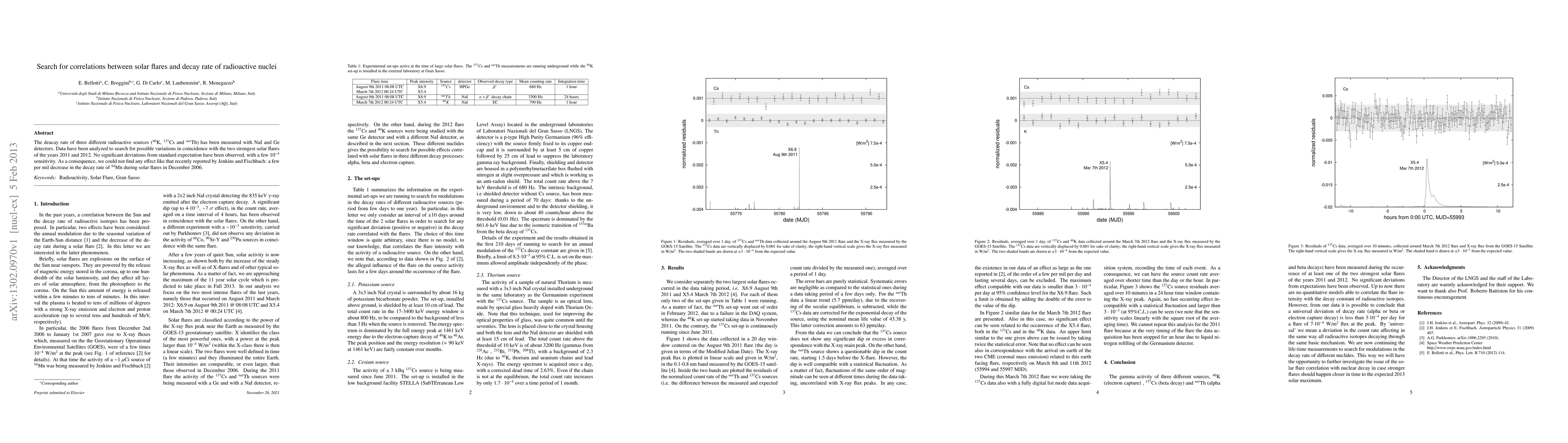 The deacay rate of three different radioactive sources 40K, 137Cs and natTh has been measured with NaI and Ge detectors. Data have been analyzed to search for possible variations in coincidence with the two strongest solar flares of the years 2011 and 2012. No significant deviations from standard expectation have been observed, with a few 10-4 sensitivity. As a consequence, we could not find any effect like that recently reported by Jenkins and Fischbach: a few per mil decrease in the decay rate of 54Mn during solar flares in December 2006.