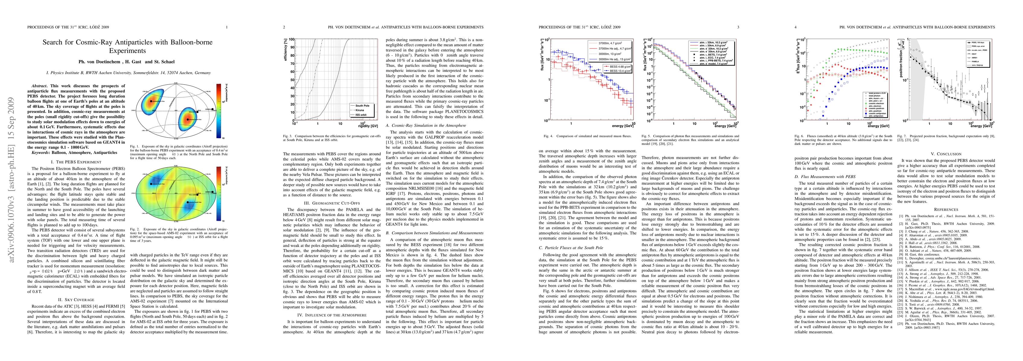 This work discusses the prospects of antiparticle flux measurements with the proposed PEBS detector. The project foresees long duration balloon flights at one of Earth's poles at an altitude of 40 km. The sky coverage of flights at the poles is presented. In addition, cosmic-ray measurements at the poles (small rigidity cut-offs) give the possibility to study solar modulation effects down to energies of about 0.1 GeV. Furthermore, systematic effects due to interactions of cosmic rays in the atmosphere are important. These effects were studied with the Planetocosmics simulation software based on GEANT4 in the energy range 0.1 - 1000 GeV.