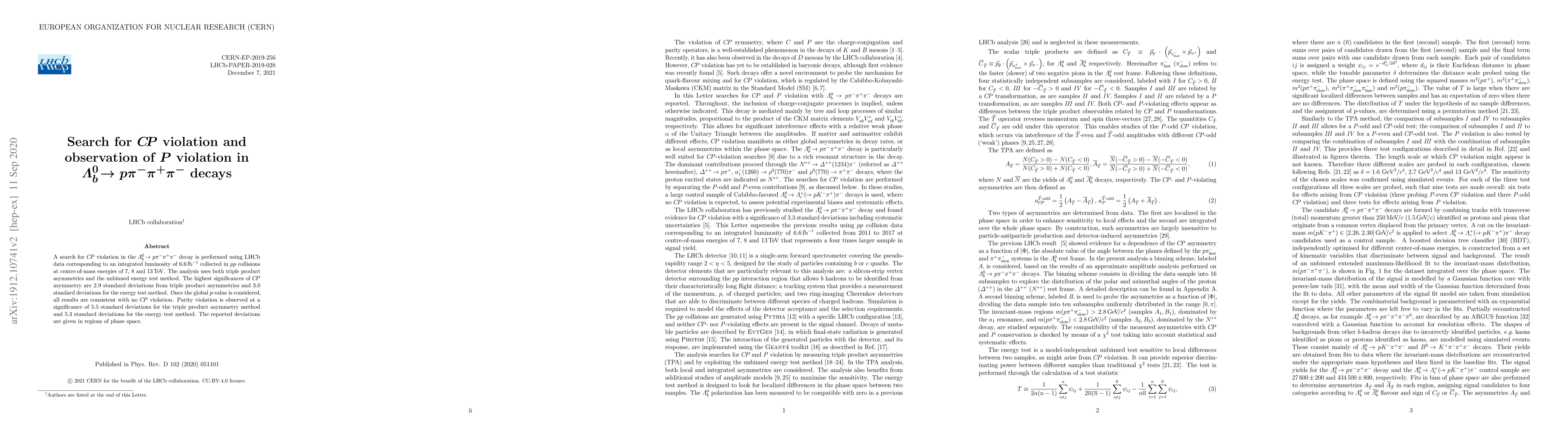 This paper reports a search for $C\!P$ violation and observes parity violation in $\Lambda_b^0 \to p \pi^- \pi^+ \pi^-$ decays using LHCb data. While no $C\!P$ violation is found, parity violation is observed with high significance.