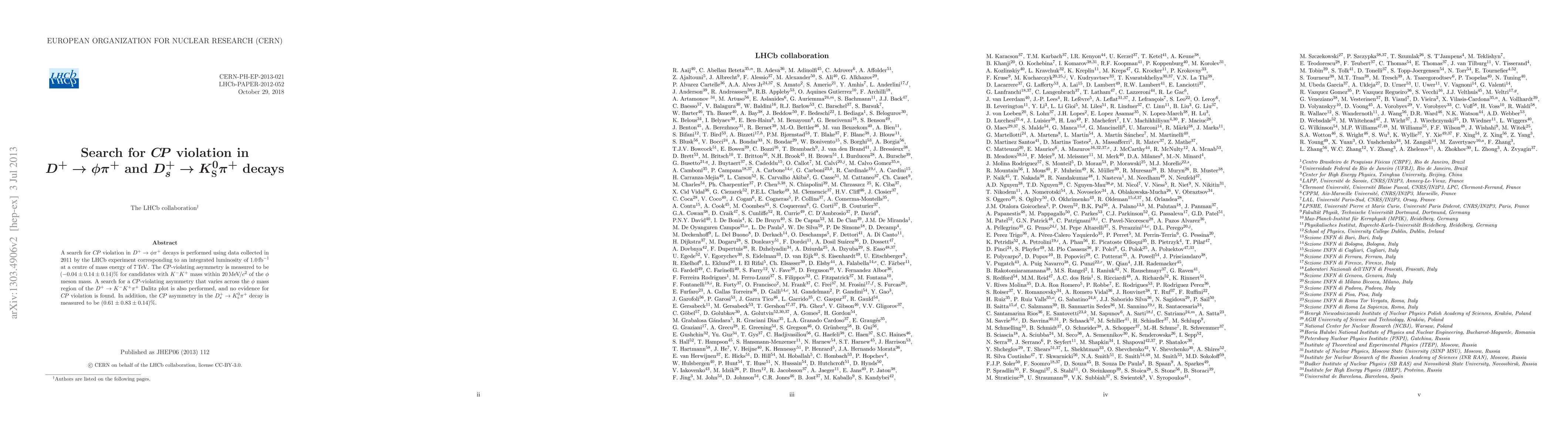 The LHCb experiment searched for CP violation in D+ -> phi pi+ and Ds+ -> Ks pi+ decays using 2011 data at 7 TeV, finding no significant CP-violating asymmetry in D+ -> phi pi+ decays. The CP asymmetry in Ds+ -> Ks pi+ decays was measured to be (0.61±0.83±0.14)%.