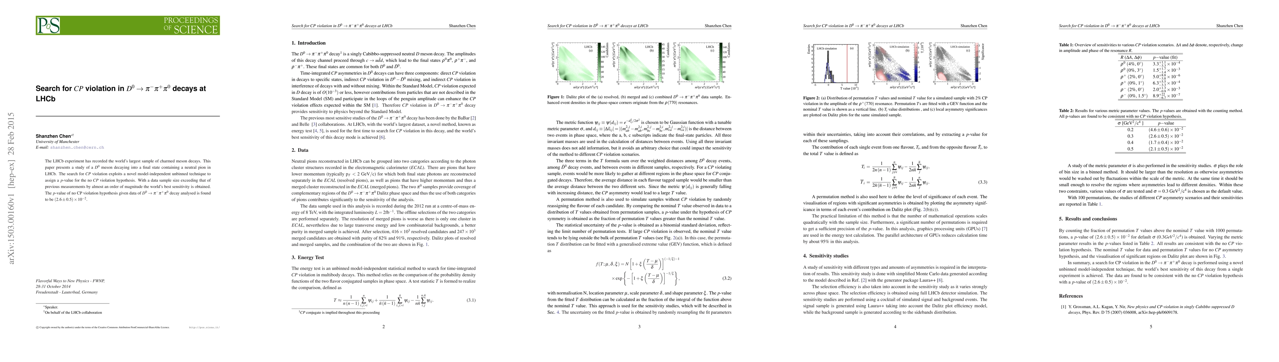 The LHCb experiment has recorded the world's largest sample of charmed meson decays. This paper presents a study of a $D^0$ meson decaying into a final state containing a neutral pion in LHCb. The search for $CP$ violation exploits a novel model-independent unbinned technique to assign a $p$-value for the no $CP$ violation hypothesis. With a data sample size exceeding that of previous measurements by almost an order of magnitude the world's best sensitivity is obtained. The $p$-value of no CP violation hypothesis given data of $D^0\rightarrow \pi^-\pi^+\pi^0$ decay analysed is found to be $(2.6 \pm 0.5)\times 10^-2$.
