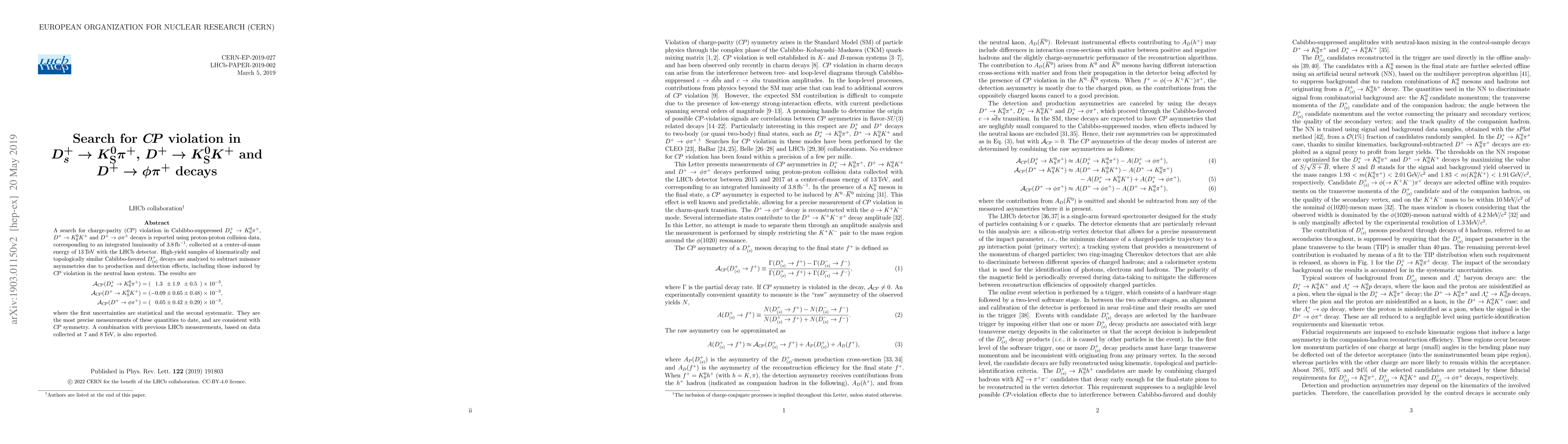 This paper investigates $CP$ violation in Cabibbo-suppressed $D_s^+$ and $D^+$ decays using LHCb data, reporting the most precise measurements to date: $\mathcal{A}_{CP}(D_s^+\to K_S^0 \pi^+) = (1.3\pm1.9\pm0.5)\times10^{-3}$, $\mathcal{A}_{CP}(D^+\to K_S^0 K^+) = (-0.09\pm0.65\pm0.48)\times10^{-3}$, and $\mathcal{A}_{CP}(D^+\to \phi \pi^+) = (0.05\pm0.42\pm0.29)\times10^{-3}$. The results are consistent with $CP$ symmetry.