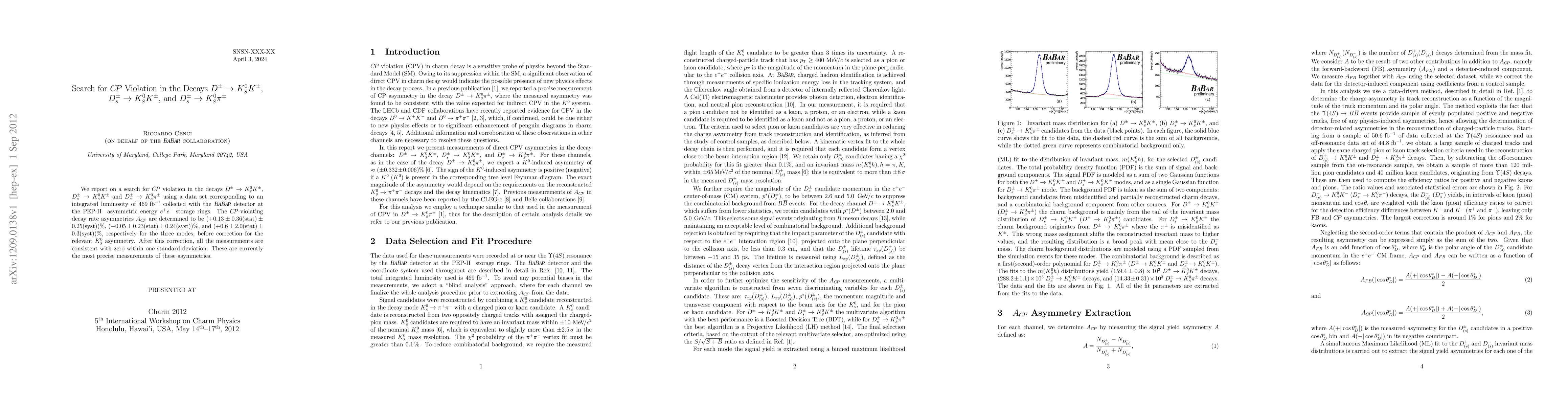 This paper reports a search for CP violation in specific meson decays using data from the BaBar detector, finding CP-violating asymmetries consistent with zero within one standard deviation. The results provide the most precise measurements of these decay asymmetries to date.