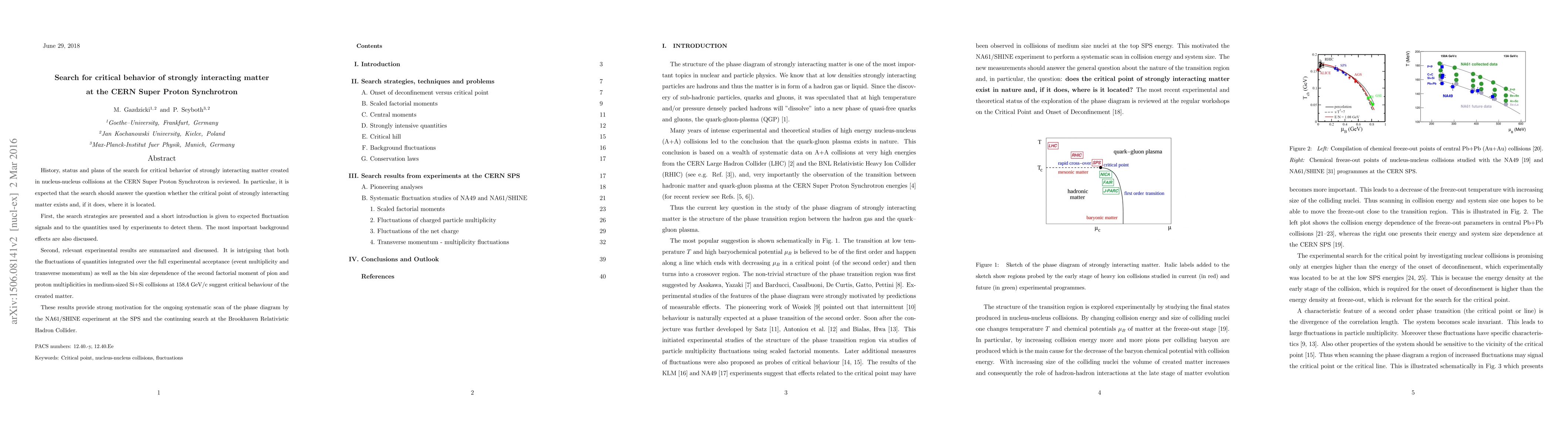 This paper reviews the history, status, and plans for investigating critical behavior in strongly interacting matter created in nucleus-nucleus collisions at CERN's Super Proton Synchrotron. It highlights experimental results suggesting critical behavior and supports ongoing systematic scans by the NA61/SHINE experiment and searches at Brookhaven.