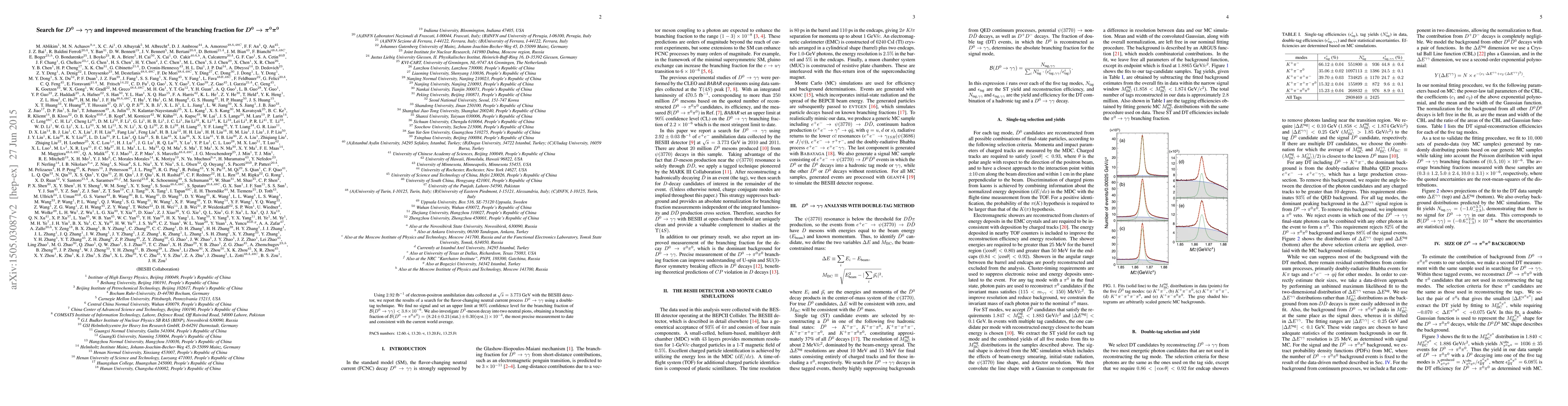 Using $2.92$ fb$^{-1}$ of electron-positron annihilation data collected at $\sqrt{s} = 3.773$~GeV with the BESIII detector, we report the results of a search for the flavor-changing neutral current process $D^0\to\gamma\gamma$ using a double-tag technique. We find no signal and set an upper limit at $90\%$ confidence level for the branching fraction of $B(D^0\to\gamma\gamma) < 3.8\times10^{-6}$. We also investigate $D^0$-meson decay into two neutral pions, obtaining a branching fraction of $B(D^0\to\pi^0\pi^0) = (8.24\pm0.21(\text{stat.})\pm0.30(\text{syst.}))\times10^{-4}$, the most precise measurement to date and consistent with the current world average
