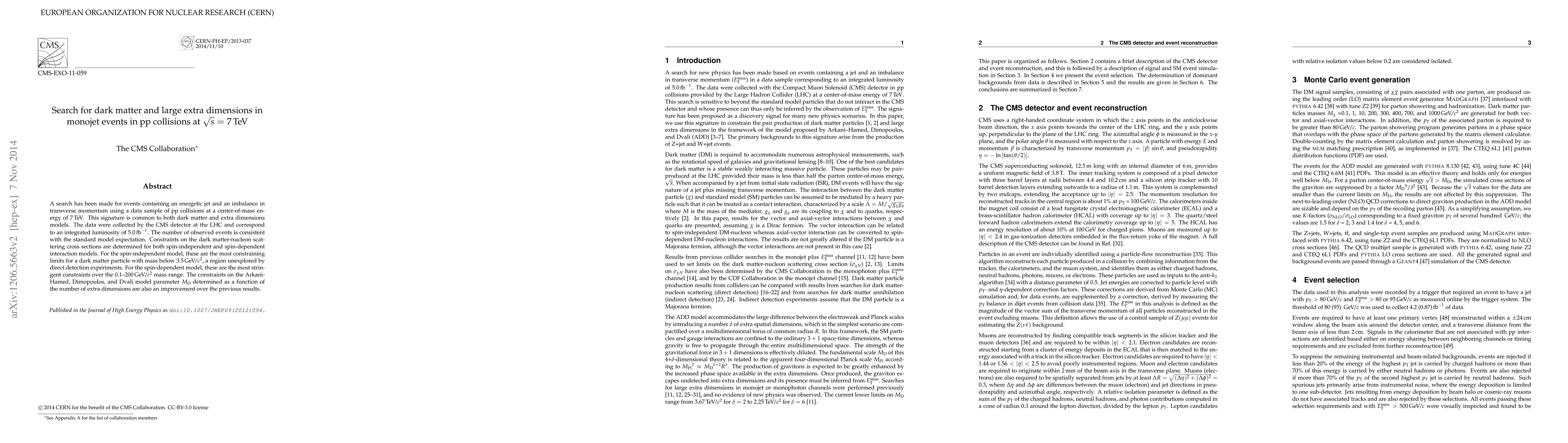 This study, using data from 7 TeV pp collisions at the LHC's CMS detector, searched for dark matter or large extra dimensions through monojet events. No significant excess beyond standard model predictions was found. New limits were set on dark matter-nucleon scattering cross sections for both spin-independent and spin-dependent models, with improved constraints over previous results, particularly for low mass dark matter particles and the Arkani-Hamed, Dimopoulos, and Dvali model parameter MD.