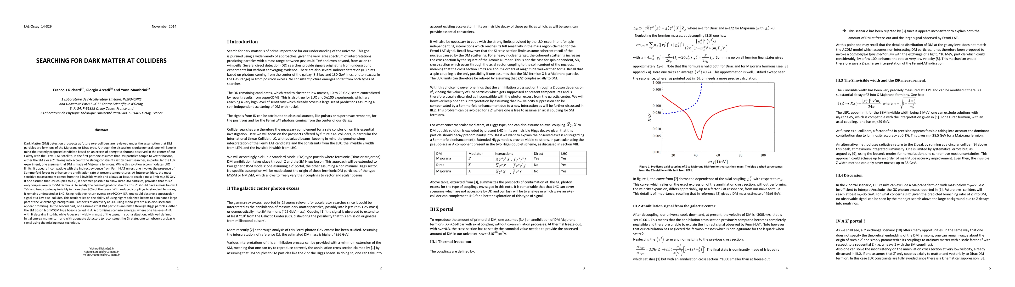 Dark Matter (DM) detection prospects at future e+e- colliders are reviewed under the assumption that DM particles are fermions of the Majorana or Dirac type. Although the discussion is quite general, one will keep in mind the recently proposed candidate based on an excess of energetic photons observed in the center of our Galaxy with the Fermi-LAT satellite. If one assume that DM couples to a Zprime, using radiative return events e+e-->XX+photon, one could observe a spectacular signal at a TeV e+e- collider. This result relies on the ability of using highly polarized beams to eliminate a large part of the W exchange background. Prospects of discovery at LHC using mono-jets are also discussed and appear promising. In the second part, one assumes that DM particles annihilate through Higgs particles, either the SM boson h or MSSM type bosons called H, A. A promising scenario emerges, where one has e+e-->HA, with H decaying into hh, while A decays invisibly in most of the cases.