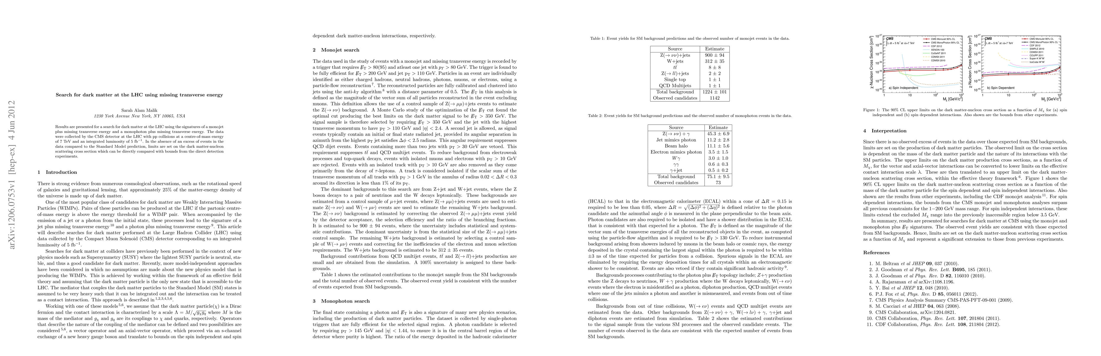This paper reports a search for dark matter at the LHC using signatures of monojet and monophoton events with missing transverse energy, finding no excess over Standard Model predictions. Limits on dark matter-nucleon scattering cross sections are established, providing constraints comparable to direct detection experiments.