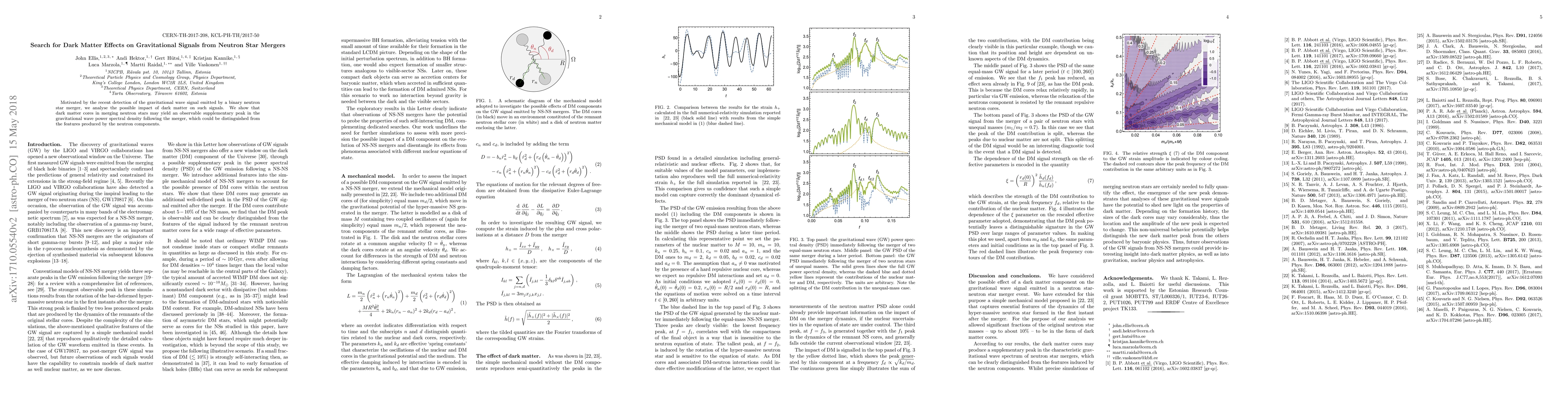 This research investigates potential dark matter effects on gravitational signals from neutron star mergers, suggesting dark matter cores might produce an observable additional peak in gravitational wave power spectral density post-merger, distinguishable from neutron components' features.