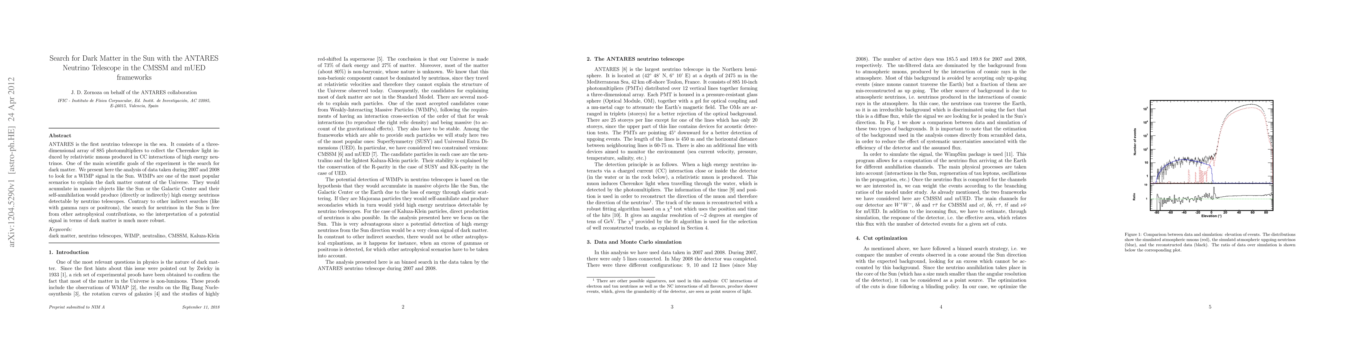 The ANTARES Neutrino Telescope analyzed data from 2007 and 2008 to search for high-energy neutrinos from WIMP self-annihilation in the Sun, aiming to detect dark matter in the CMSSM and mUED frameworks. Unlike other indirect searches, this method is less affected by astrophysical background, providing a more robust interpretation of potential signals.